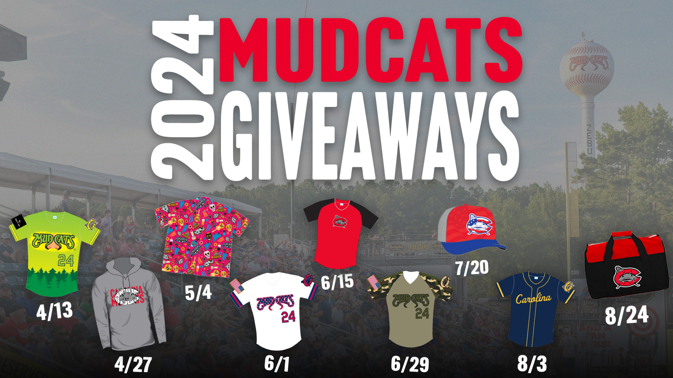 ZEBULON, N.C. – The Carolina Mudcats today announced all nine souvenir giveaway items for the upcoming 2024 season at Five County Stadium. The new souvenir giveaway schedule, spread across nine Souvenir Saturday dates, is highlighted by five jerseys, a duffel bag and wearable items including a hoodie, button-up shirt and