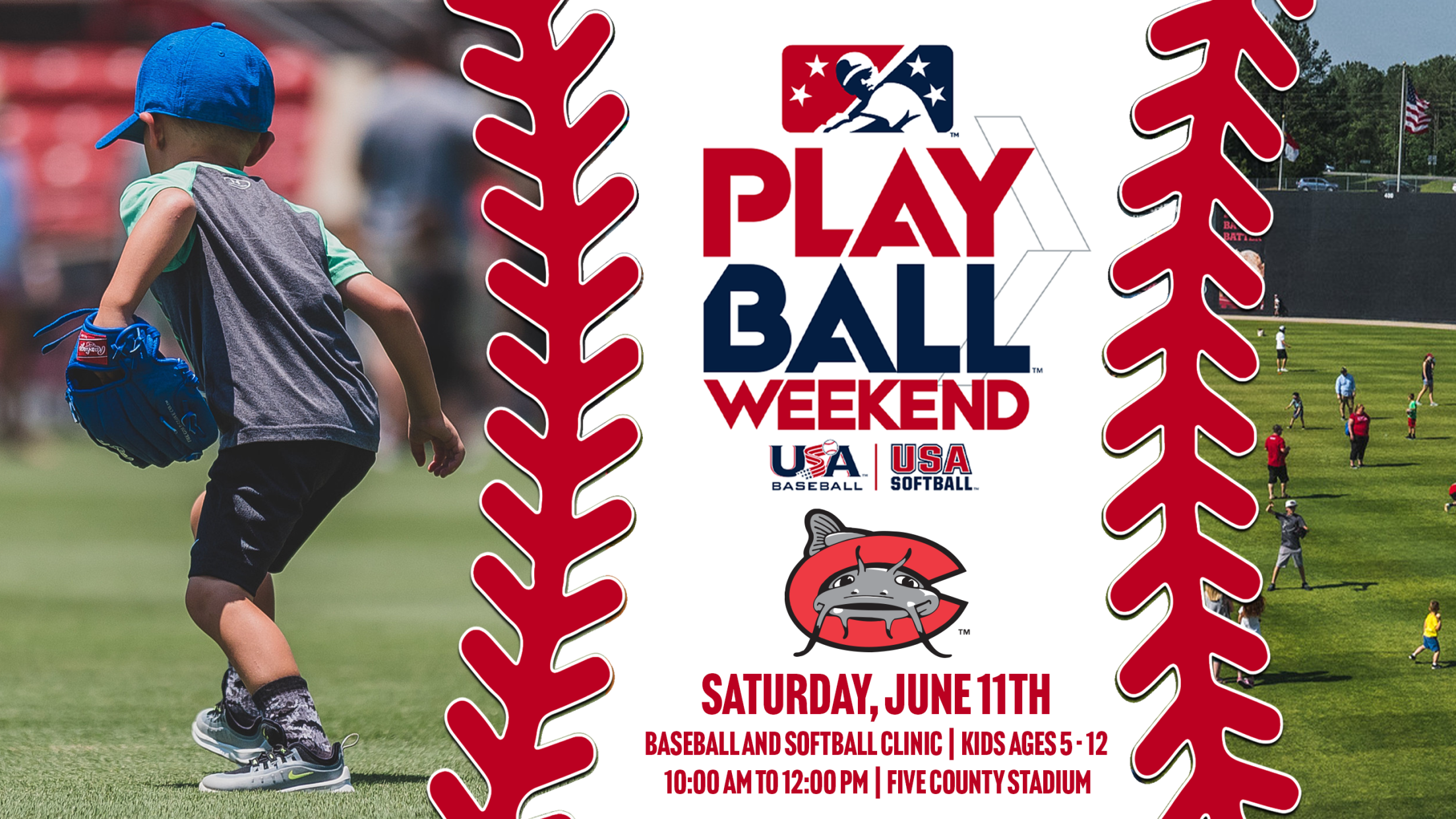 ZEBULON – The Carolina Mudcats, in partnership with Major League Baseball, will host a free Play Ball Weekend baseball skills clinic at Five County Stadium on Saturday, June 11 from 10:00 a.m. to 12:00 p.m. This free event is open to all kids ages 5-12.