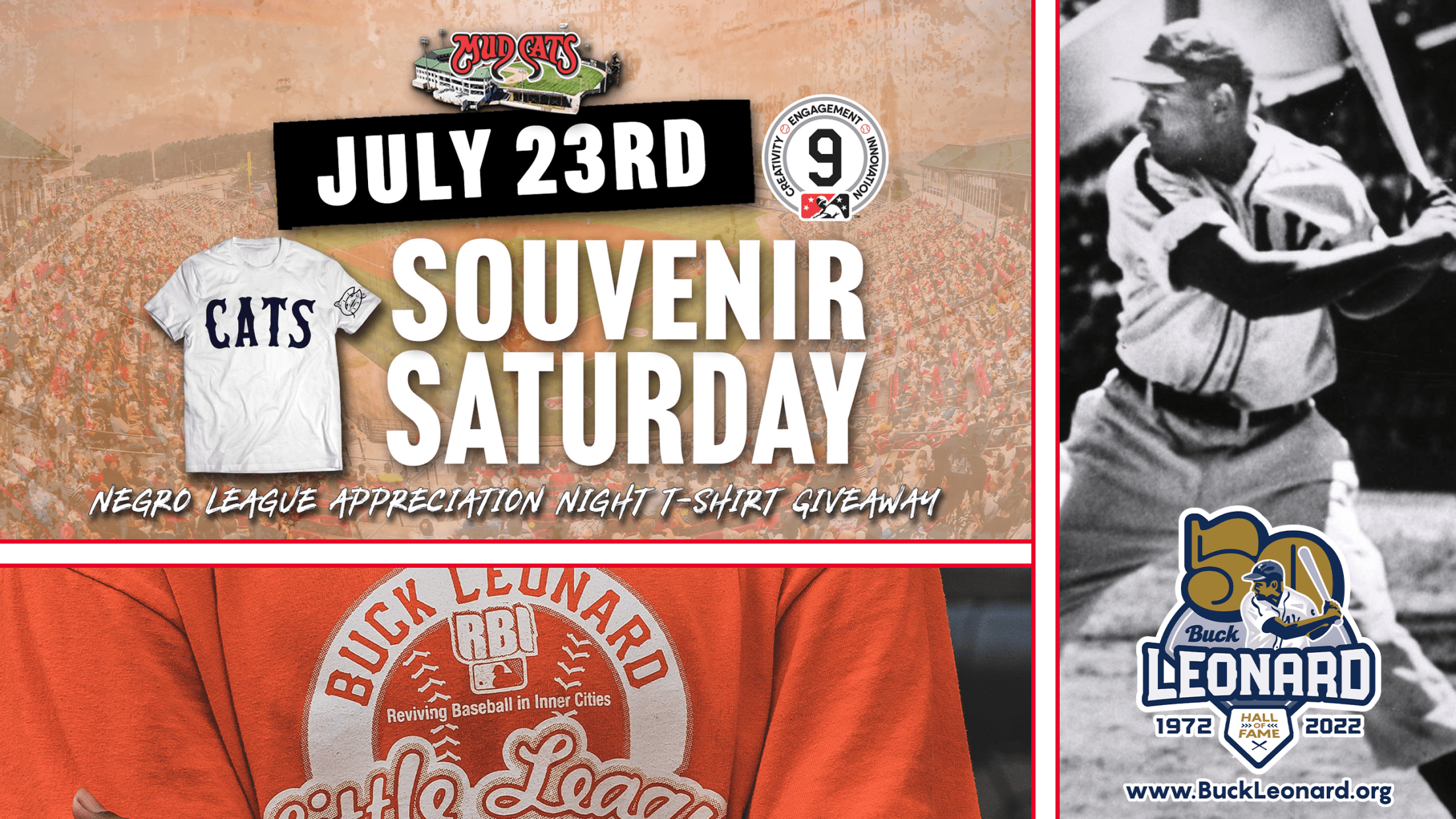 ZEBULON - The Carolina Mudcats will host Negro Leagues Tribute Night on Saturday, July 23, at Five County Stadium. Part of Minor League Baseball's "The Nine" initiative, and in partnership with the Buck Leonard Association, Negro Leagues Tribute Night is highlighted by a souvenir t-shirt giveaway, as well as pre-game and in-game tributes designed to celebrate the legacy of local Negro League teams and players, specifically hall of famer and Rocky Mount, NC native Buck Leonard.