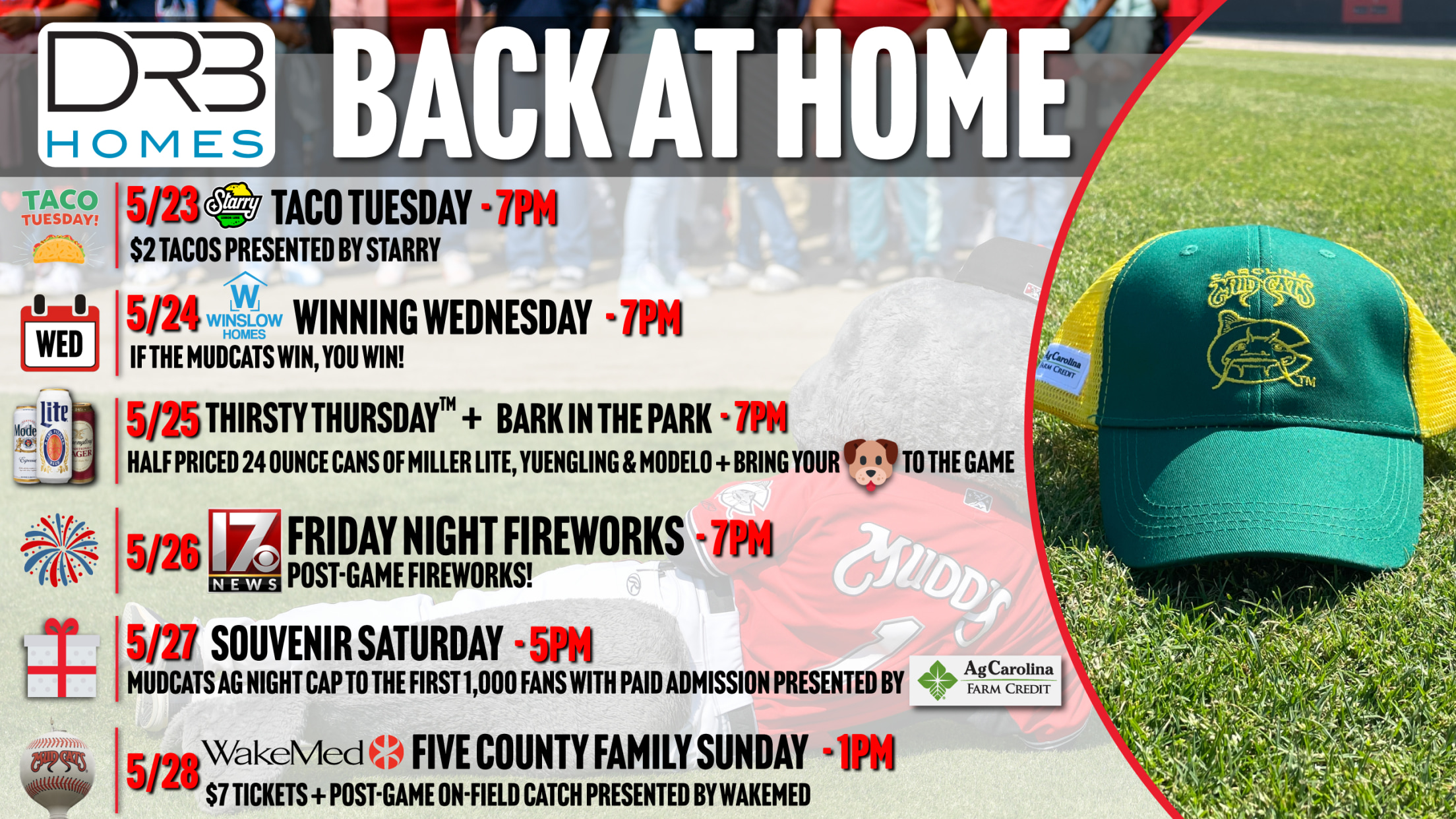 Winning Wednesday presented by Winslow Homes: A Mudcats victory on the field means a victory for the fans in the stands with Winning Wednesday presented by Winslow Homes. Should the Mudcats win, then fans attending this Wednesday’s game can exchange their game ticket for a ticket of equal value, for free, to Carolina’s next Wednesday home game.