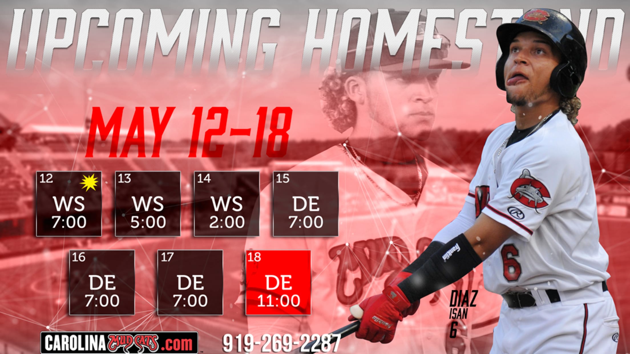 The new home stand is highlighted by Friday Night Fireworks presented by Sears Home Services and Pack Your Bags Night featuring a trip giveaway to Myrtle Beach, SC from VisitMyrtleBeach.com on Friday, May 12. It also features Cats and Canes Night presented by the Brain Injury Association of NC and a Mother's Day Carnation Giveaway on Saturday, May 18.