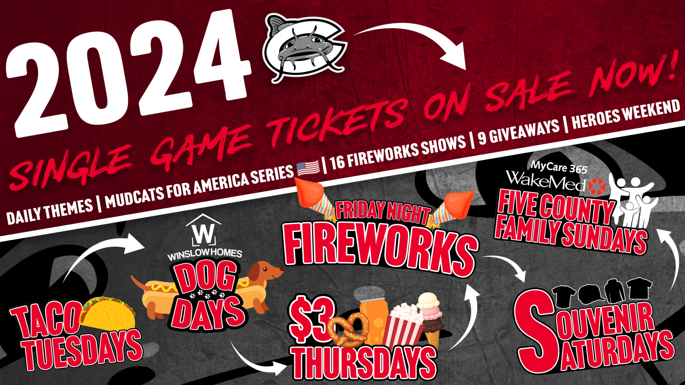 ZEBULON, N.C. – The Carolina Mudcats today announced that single game tickets are now available for purchase for the upcoming 2024 season at Five County Stadium. The team also announced its full promotions schedule featuring 16 total fireworks shows, new nightly promotions, nine souvenir giveaways and more.