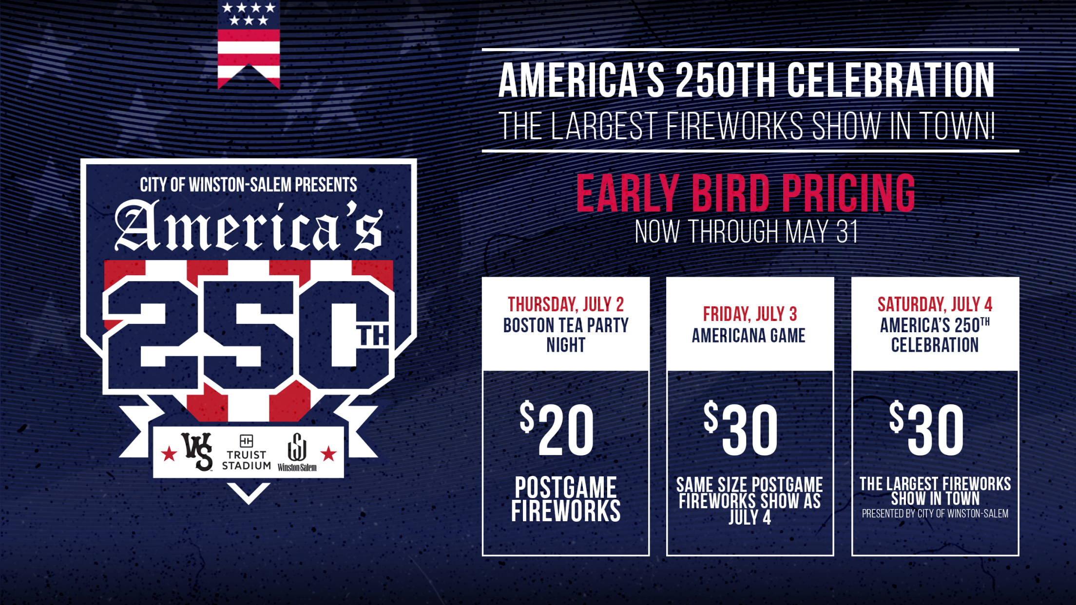 The Winston-Salem Dash have announced Early Bird Pricing for one of the most anticipated stretches of the 2026 season, America’s 250th Celebration, presented by City of Winston-Salem, at Truist Stadium.