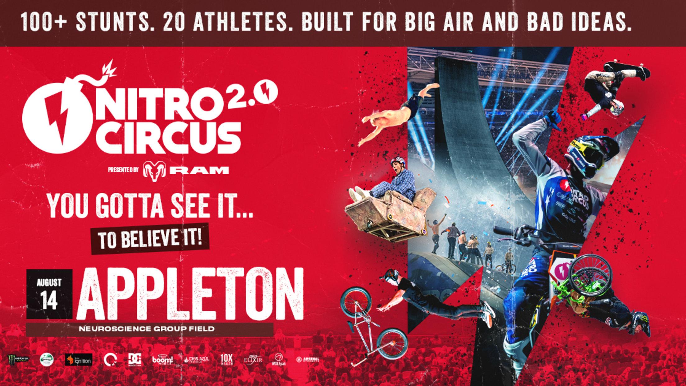 APPLETON, WISC. (APRIL 6, 2026) - Thrill Sports, P1 Live and RNC Entertainment proudly announce the 2026 NITRO CIRCUS 2.0 TOUR Presented by Ram Trucks. Nitro Circus’ electrifying live event is back and better than ever, and will make a stop in Appleton at Neuroscience Group Field on Friday, August