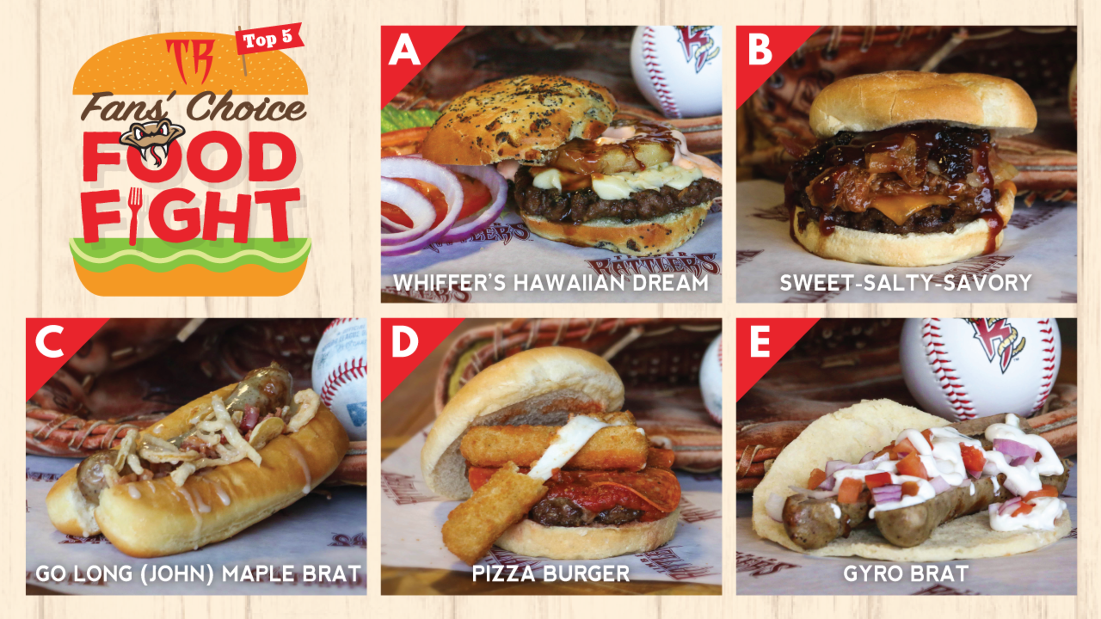 GRAND CHUTE, WI – The selection process to get to the finalists in this year’s Food Fight was one of the most difficult the Wisconsin Timber Rattlers have ever had in seven contests. We have gone through all 72 entries and have the best Burger & Brat recipes submitted by our fans for a Final Five. The winner of this year’s Food Fight will go on the concession menu at Neuroscience Group Field at Fox Cities Stadium this season.