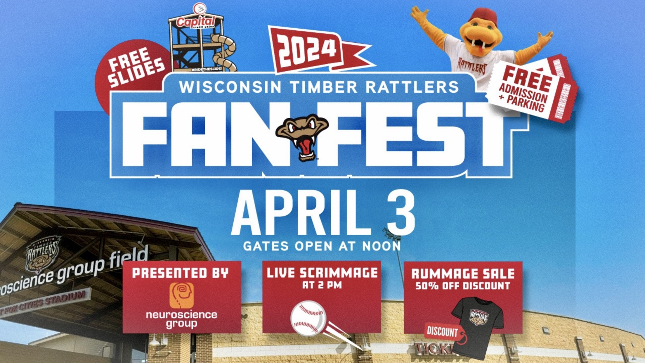 GRAND CHUTE, WI – Fans of the Wisconsin Timber Rattlers will get their first official look at the 2024 team during Fan Fest at Neuroscience Group Field at Fox Cities Stadium on Wednesday, April 3. The event is scheduled for noon to 4:00pm. Admission and parking are free for Fan Fest presented by Neuroscience Group!
