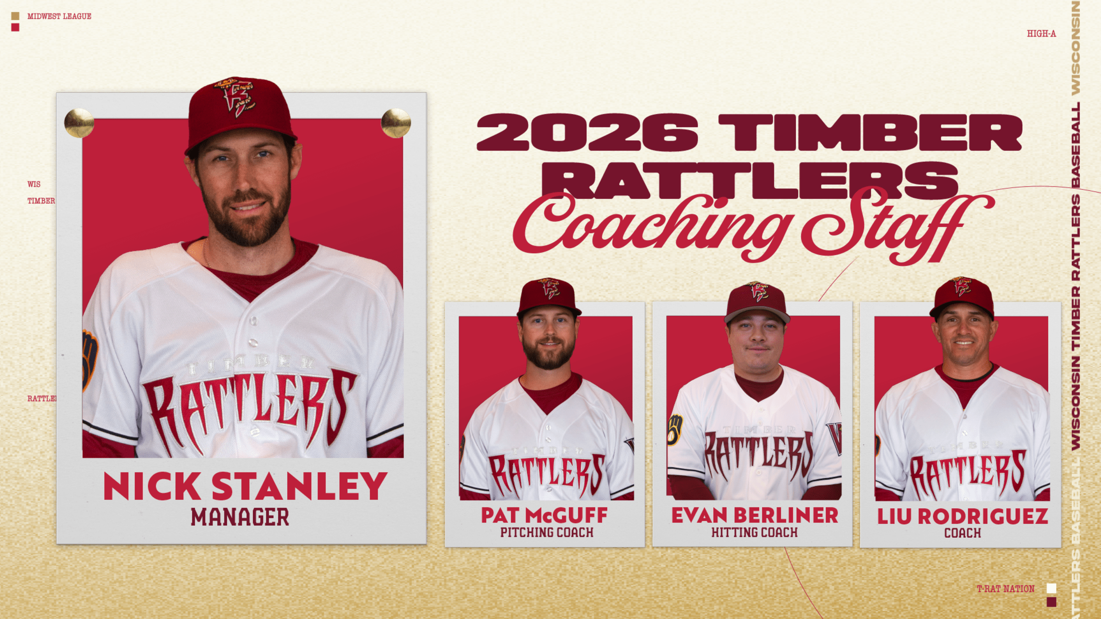 Hitting coach Evan Berliner will return in that role for his second consecutive season with the Timber Rattlers. Pitching coach Patrick McGuff, coach Liu Rodriguez, and Associate coach Dalton Stambaugh round out Stanley’s coaching staff. Athletic Trainer Lauren Roberts, Strength & Conditioning Coordinator Luis Rios-Reyes, Associate Athletic Trainer Maggie Cannatella, and Strength & Conditioning Associate Bryce Smith are members of the Timber Rattlers support staff for 2026.