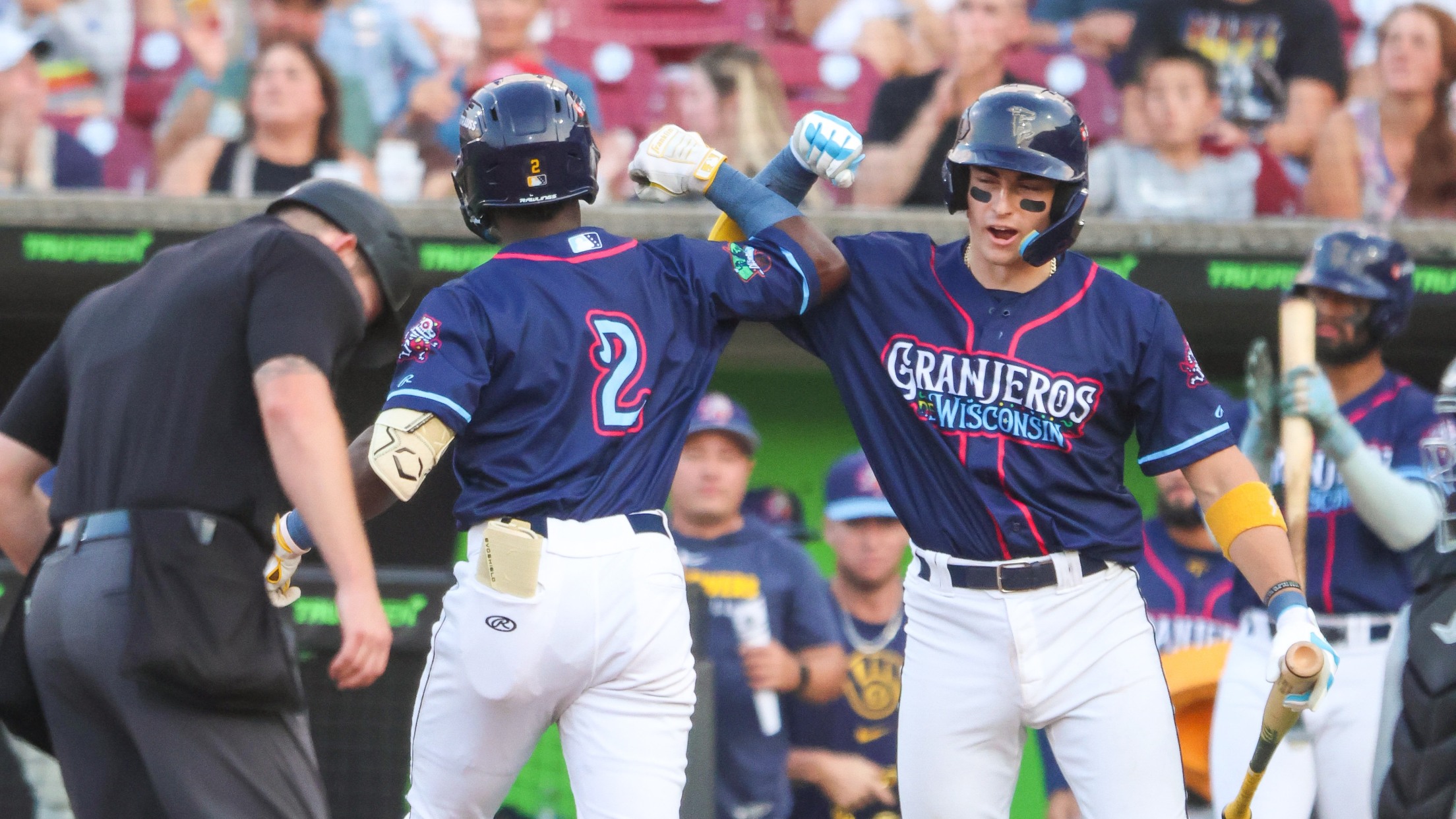 Luis Peña (2) is congratulated by Marco Dinges after crossing home plate on Tuesday night. Peña had just completed a trip around the bases after his second home run in six games with Wisconsin. (Wisconsin Timber Rattlers)