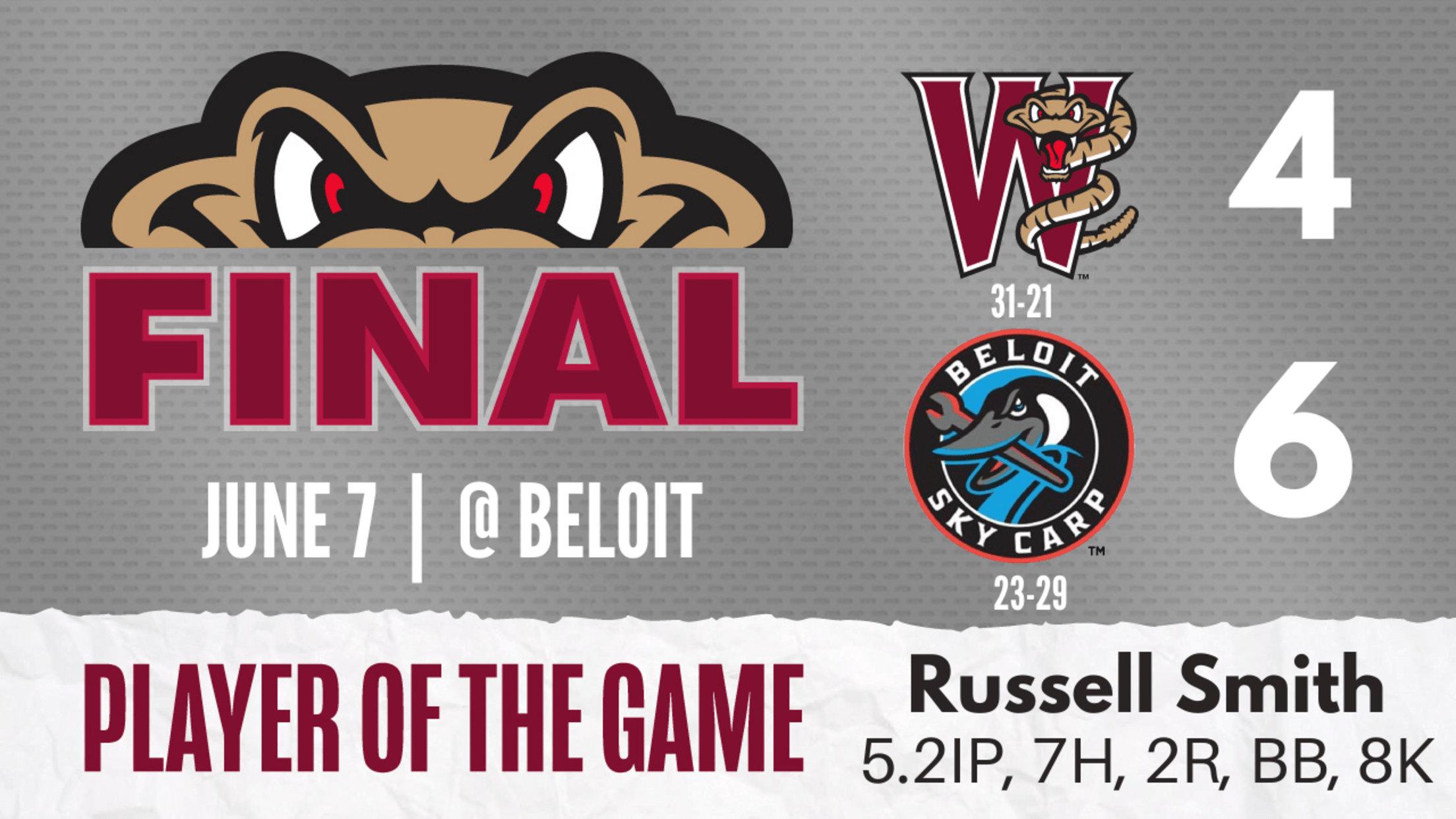 BELOIT, WI – The Wisconsin Timber Rattlers got a fine start from Russell Smith and some timely hits to take a 4-1 lead into the late innings against the Beloit Sky Carp on Tuesday night at ABC Supply Stadium. However, the Sky Carp rallied past Wisconsin for a 6-4 victory. The loss dropped Wisconsin a little farther behind in the division race.