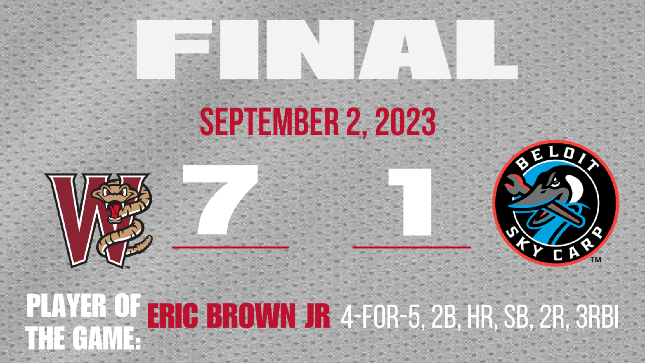 BELOIT, WI – The Wisconsin Timber Rattlers were looking for their first seven-game winning streak since the 2014 season but trailed the Beloit Sky Carp 1-0 with two outs and two on in the top of the ninth inning on Saturday night at ABC Supply Stadium. That was when Eric Brown Jr took over the game. Brown, who ended the game with four hits, launched a three-run homer to put the Rattlers in front. The hit also opened the floodgates for the Rattlers as the team would collect four runs and ten hits after the homer to go on to a 7-1 victory over the Sky Carp.