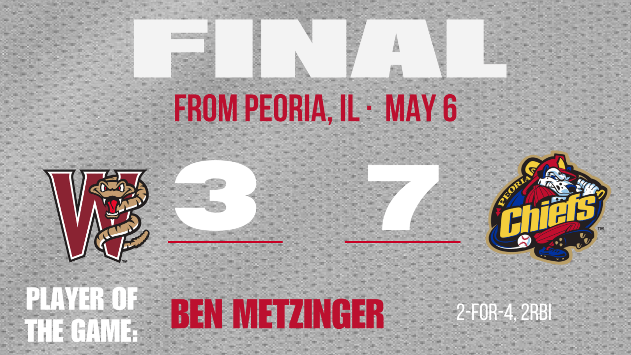 Wisconsin tried to rally in the top of the sixth inning. Moore started the inning with a double. Metzinger drove in Moore with a single and the Rattlers were down 5-3. Wisconsin had runners on first and second with one out in the frame, but the Peoria defense turned an inning-ending double play.