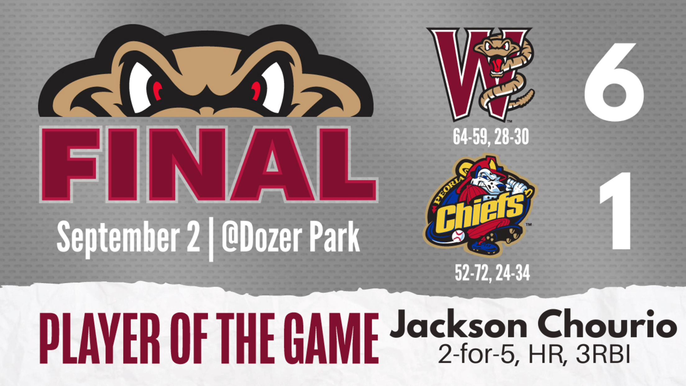 Peoria (52-72 second half, 24-34 second half) came back to tie the game in the bottom of the second inning. The Chiefs had one out with Mack Chambers at third and Francisco Hernandez at second. Tommy Jew singled to center to score Chambers. Hernandez also tried to score but was thrown out at the plate on a one-hop throw from Chourio.