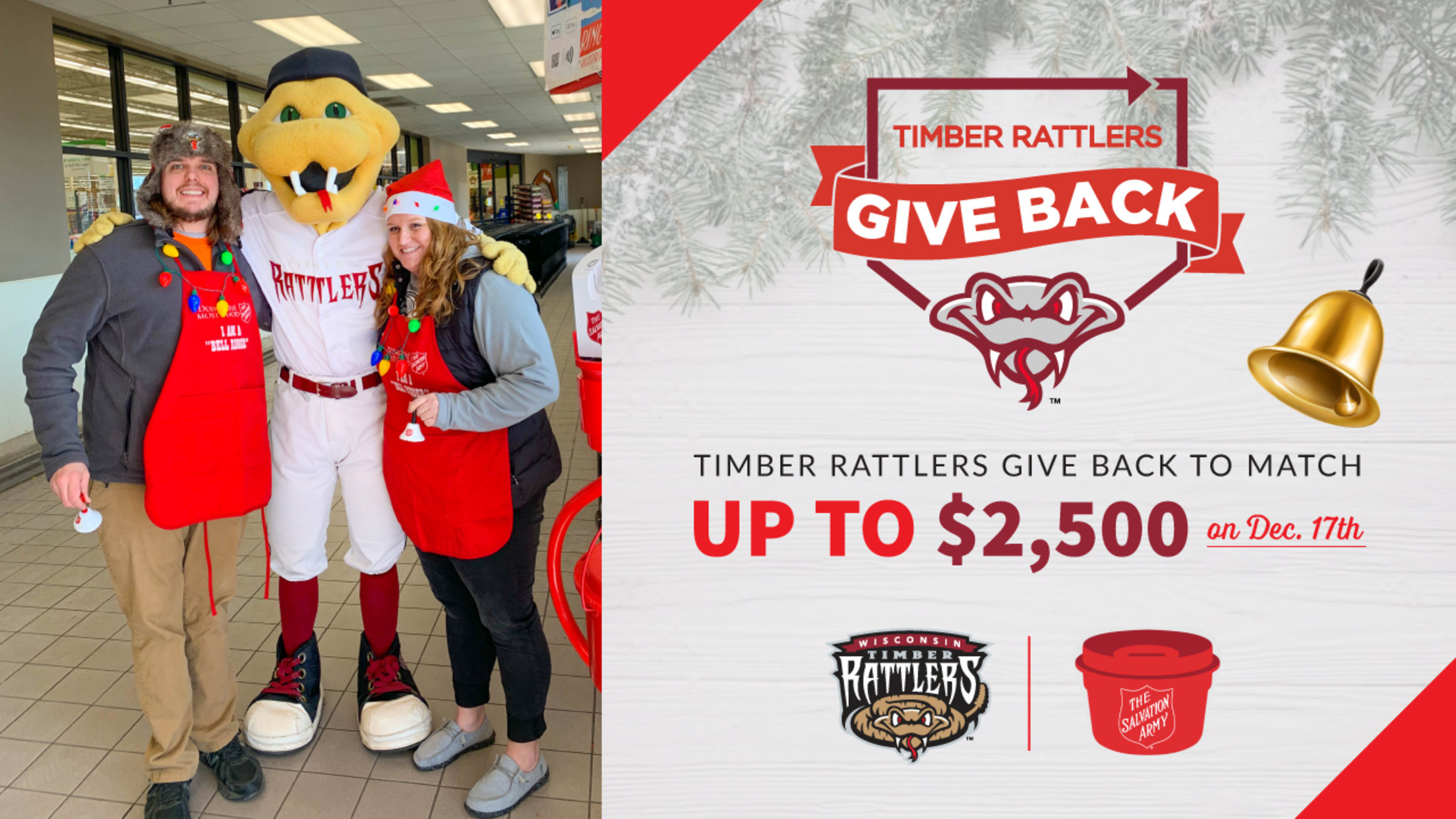 Timber Rattlers staff members will be ringing bells for the Salvation Army Fox Cities at the Festival Foods located at 1200 West Northland Avenue from 8:00am to 4:00pm on December 17 with appearances from Fang and Whiffer during the day.