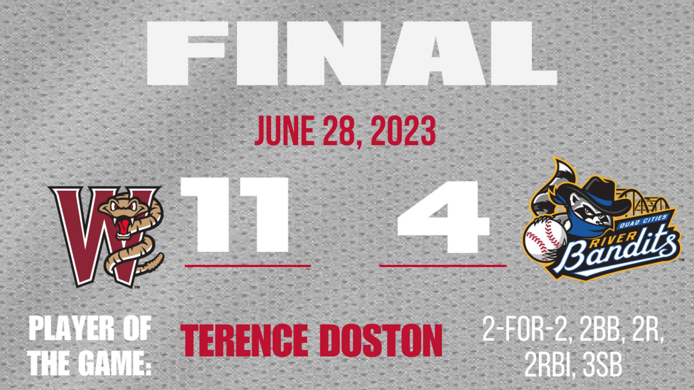 DAVENPORT, IA – The Wisconsin Timber Rattlers used an eight-run top of the third inning and overcame a sloppy bottom of the third inning to defeat the Quad Cities River Bandits 11-4 at Modern Woodmen Park Wednesday night. Terence Doston reached base four times in four plate appearances and either