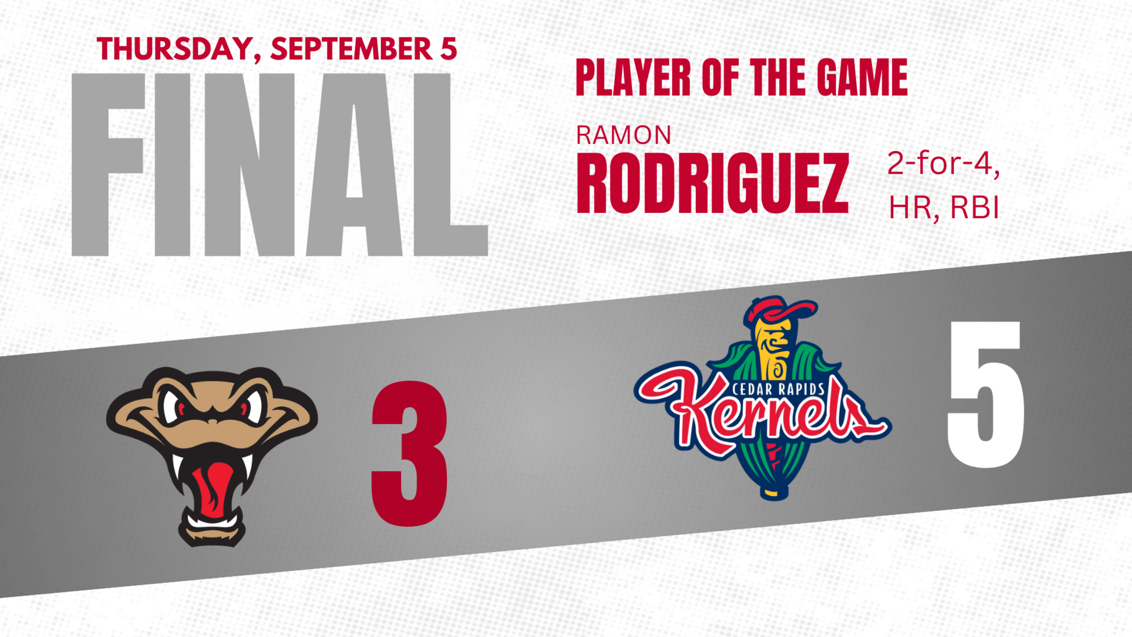 CEDAR RAPIDS, IA – The Wisconsin Timber Rattlers made a habit of scoring early and often on their way to their first half division title and their first playoff spot since 2016. The Rattlers continued that trend well into the second half. However, their opponents have turned the tables on the Timber Rattlers lately and the Cedar Rapids Kernels jumped to a 5-0 lead on the way to a 5-3 victory over the Rattlers on Thursday night at Rise 2 Greatness Field.