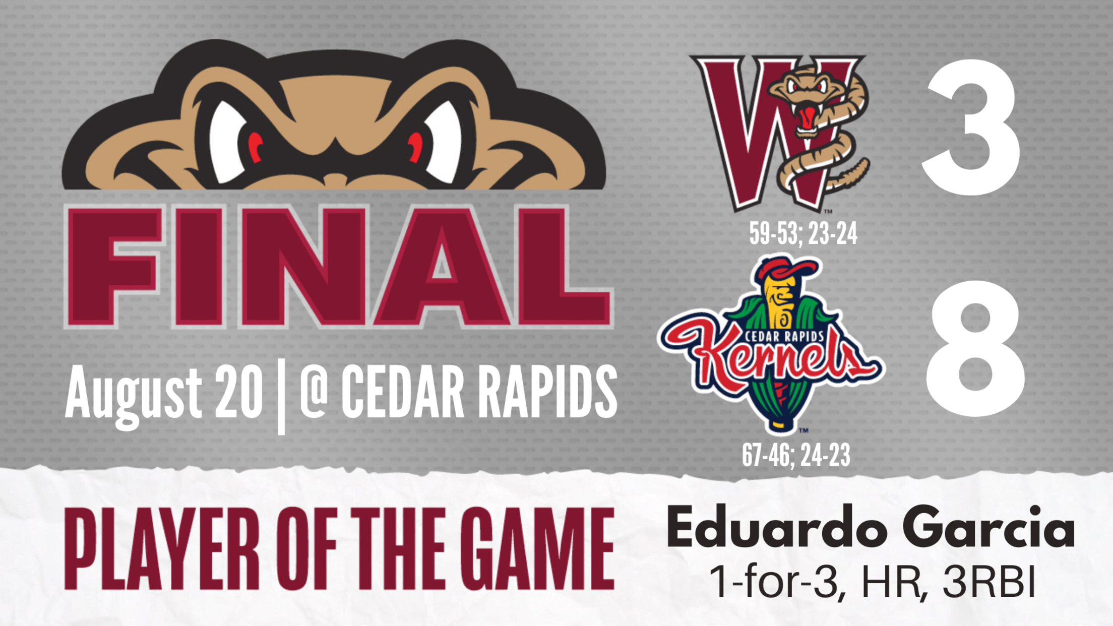 Darrien Miller singled and Ben Metzinger reached on an error to start the top of the first against Kernels starting pitcher David Festa. They were at second and third with two outs when Eduardo García unloaded on a 1-1 pitch from David Festa for a long home run to left-center and a 3-0 lead for the Rattlers (59-53 overall, 23-24 second half).