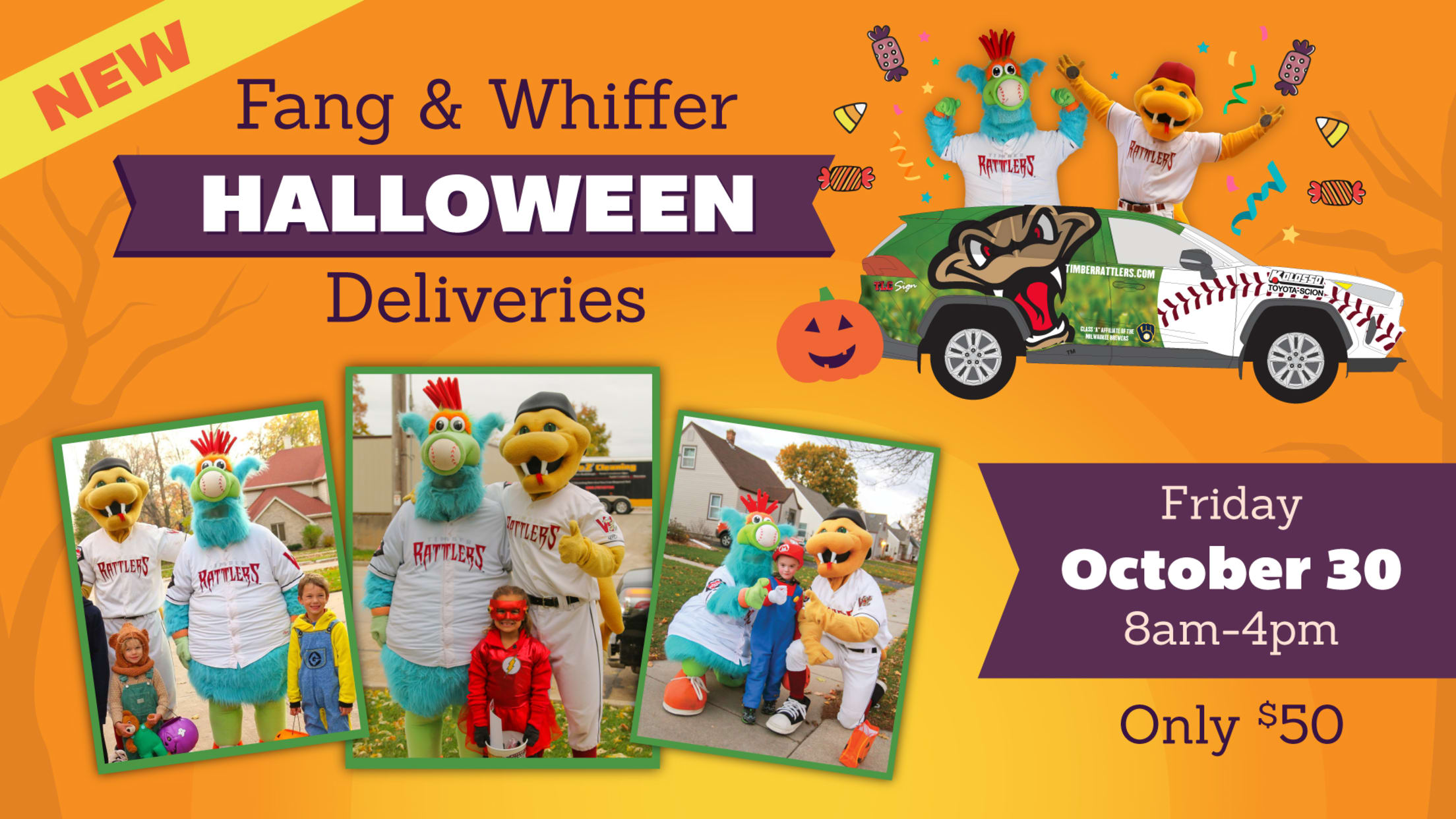 Fang and Whiffer will be available for Halloween deliveries to your home between 8:00am and 4:00pm on Friday, October 30. For $50, both mascots will bring a pumpkin and a trick or treat goodie for the child. Fang and Whiffer will also be in costume and you can get a picture of them with the child.