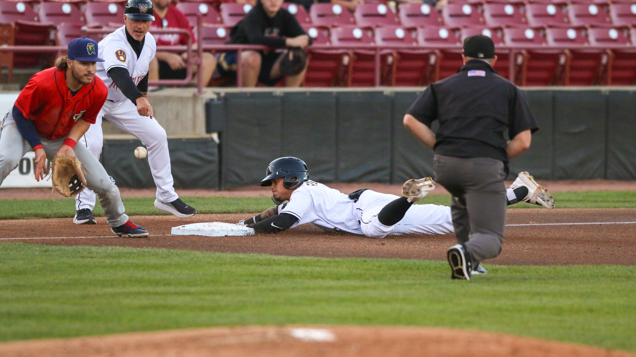 Carlos Rodriguez slides into third base for a triple in the first inning on September 7. Rodriguez drove in two runs with this three-base hit. (Wisconsin Timber Rattlers)