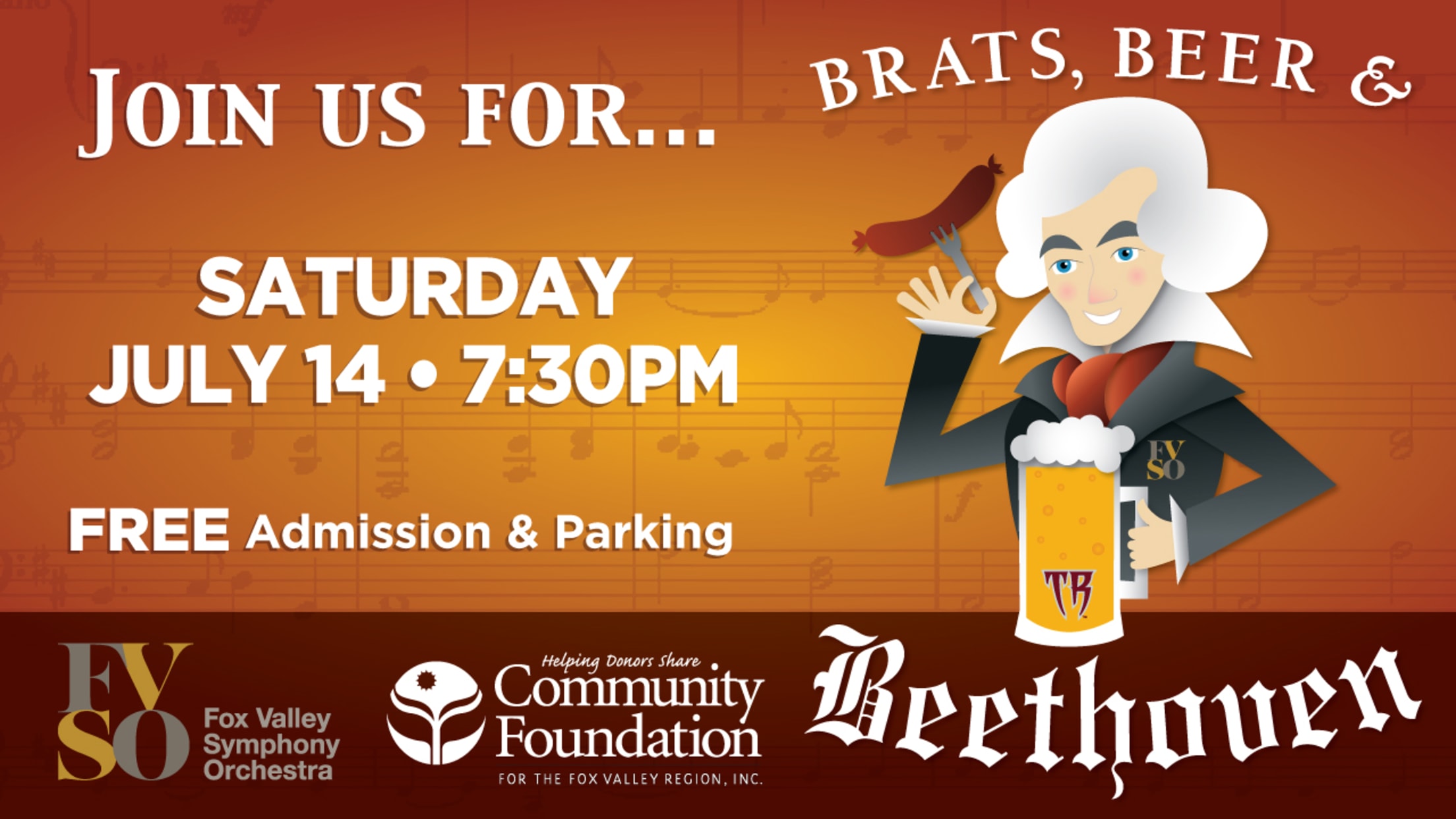 GRAND CHUTE, WI - The Fox Valley Symphony Orchestra will hold Brats, Beer, & Beethoven No. 4 on Saturday, July 14 at Neuroscience Group Field at Fox Cities Stadium at 7:30pm. The event, presented by Community Foundation is FREE and open to the public. Sponsors for the event include Neuroscience Group, Fox Communities Credit Union, Jewelers Mutual Insurance, Bergstrom Automotive, and Kimberly Clark.