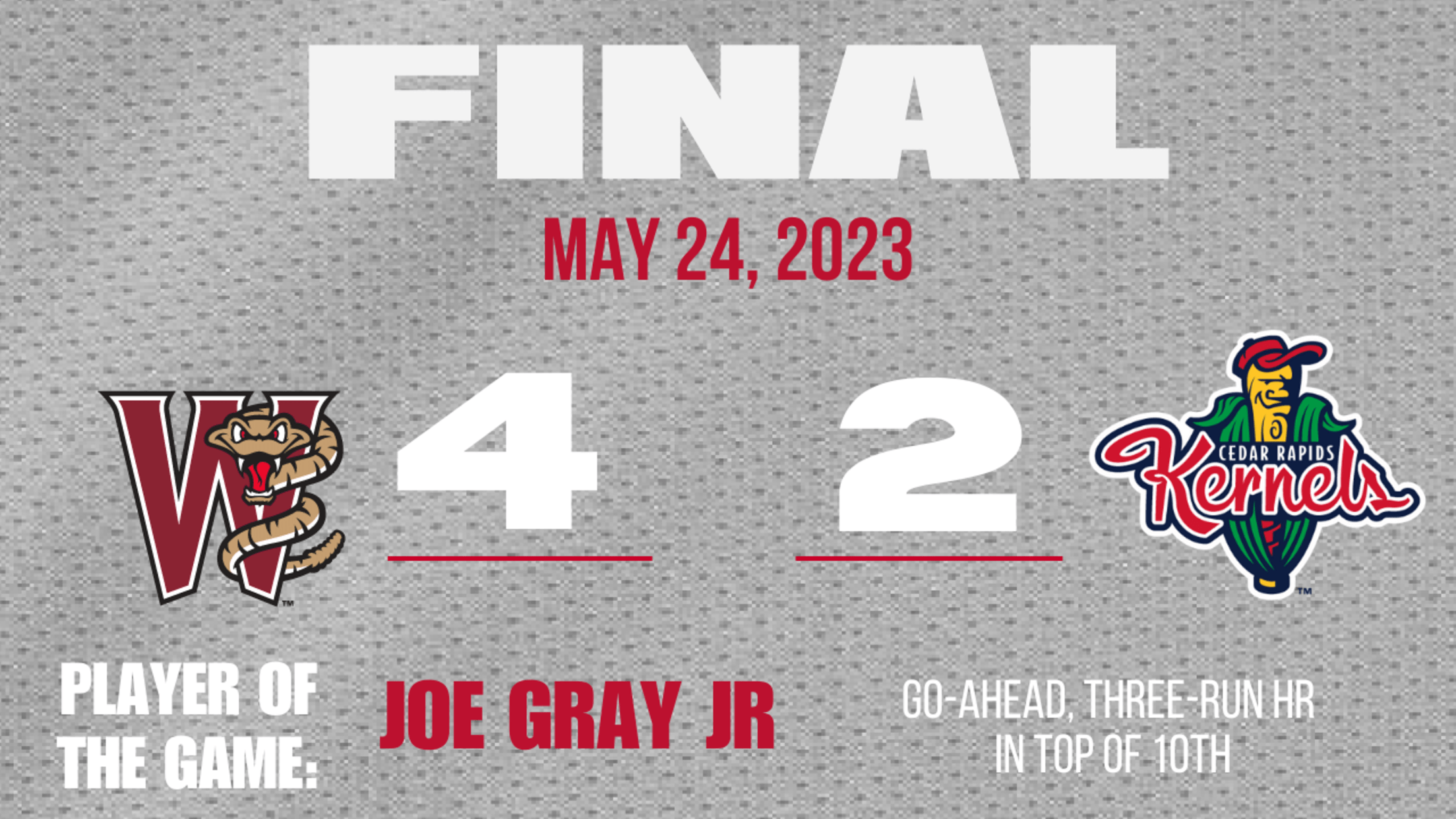 CEDAR RAPIDS, IA – Joe Gray Jr turned around a frustrating day with one swing of the bat to send the Wisconsin Timber Rattlers to a 4-2 win in ten innings over the Cedar Rapids Kernels on Wednesday afternoon at PG Cares Field. Gray hit a three-run home run with two outs in the top of the tenth to break a 1-1 tie and the Rattlers held on for the victory.