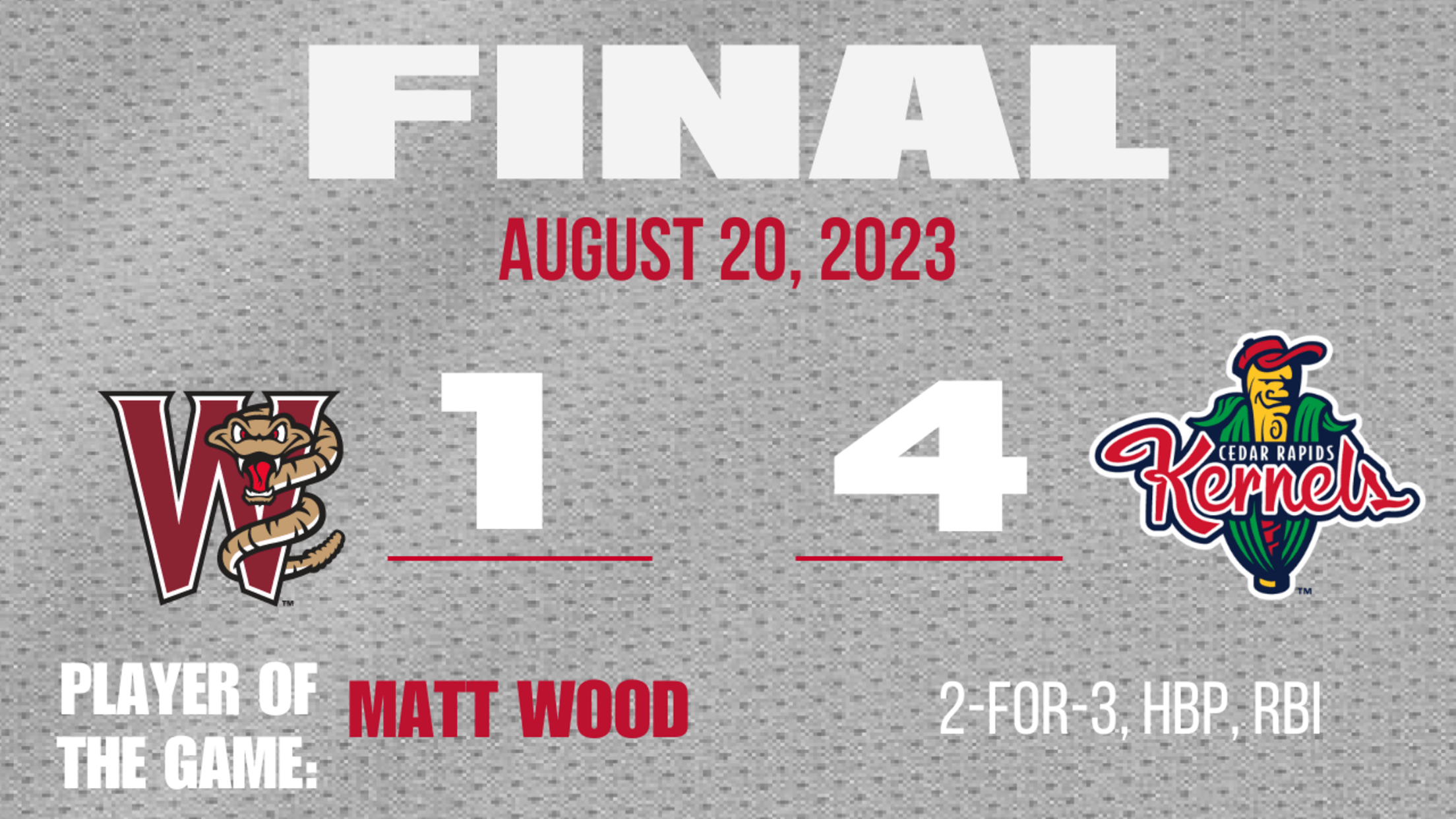 Wisconsin (22-26, 48-64) staged a two-out rally in the top of the fourth inning to get on the scoreboard. Hendry Mendez doubled, and Matt Wood followed with a single up the middle to drive in Mendez. Then, Joe Gray Jr singled and an error on the play put runners at second and third, but Kernels starter Zebby Matthews got the final out to maintain the three-run lead.