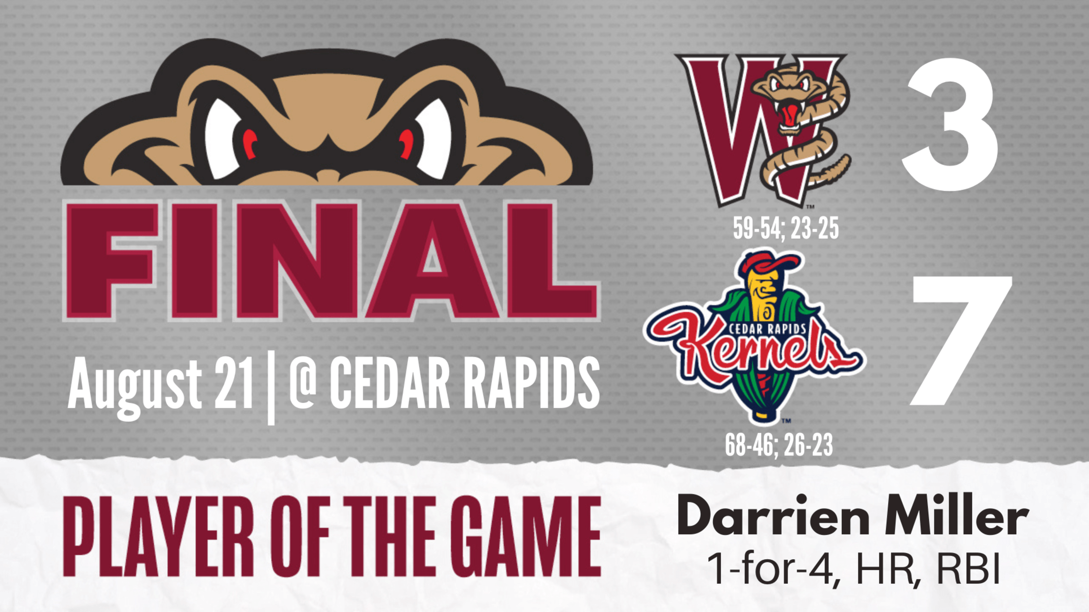CEDAR RAPIDS, IA – The Wisconsin Timber Rattlers clawed their way back into a 2-2 tie with the Cedar Rapids Kernels on Sunday afternoon at Perfect Game Field. Then, the Kernels scored five runs on three swings of the bat in the bottom of the sixth and pulled away for a 7-3 win in the final meeting of the season between the two teams.