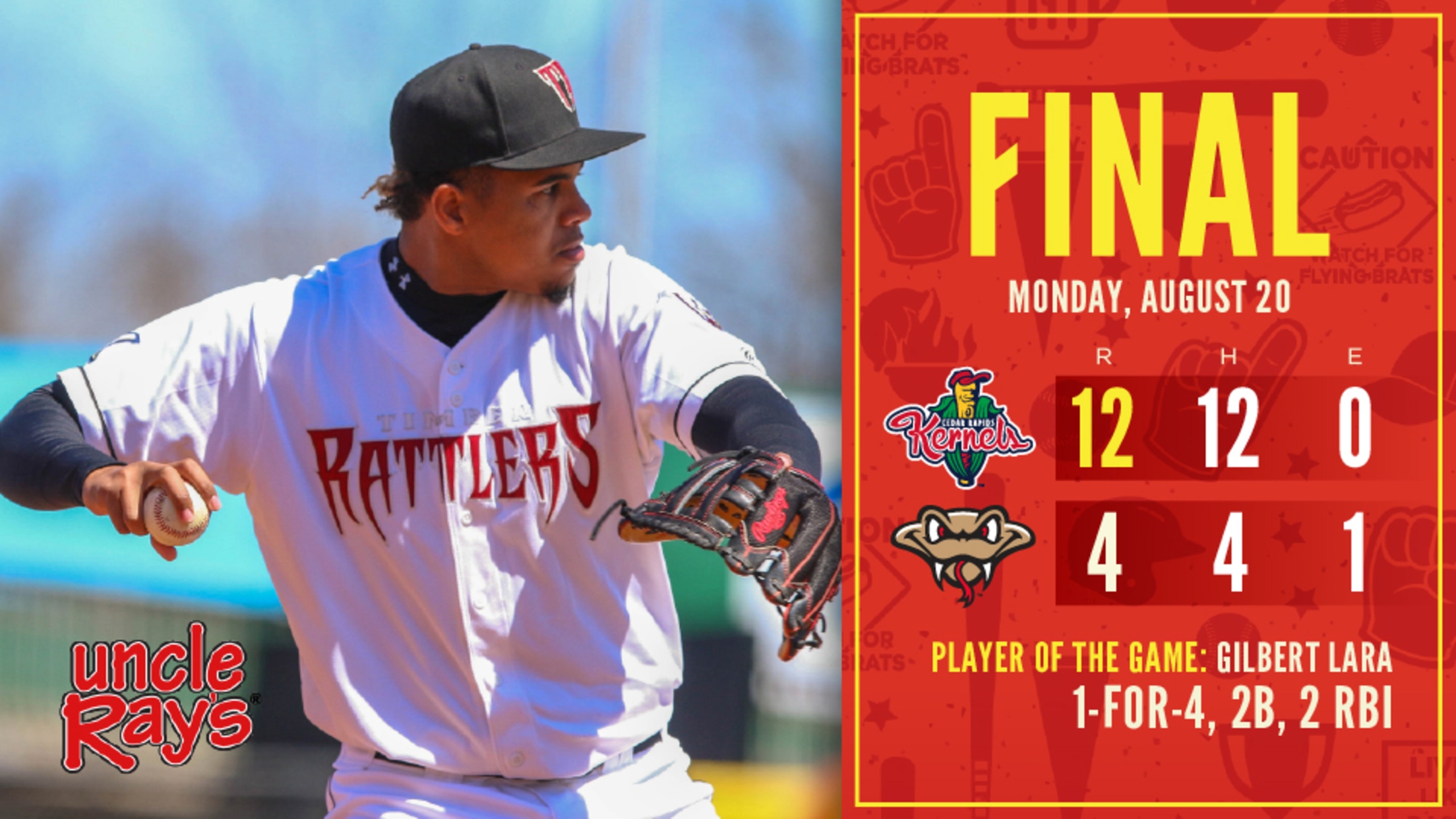 Cedar Rapids didn't have a hit after the double by Rodriguez in the third inning until the eighth inning. But, when the Kernels bats woke up again, they blew past the Rattlers.