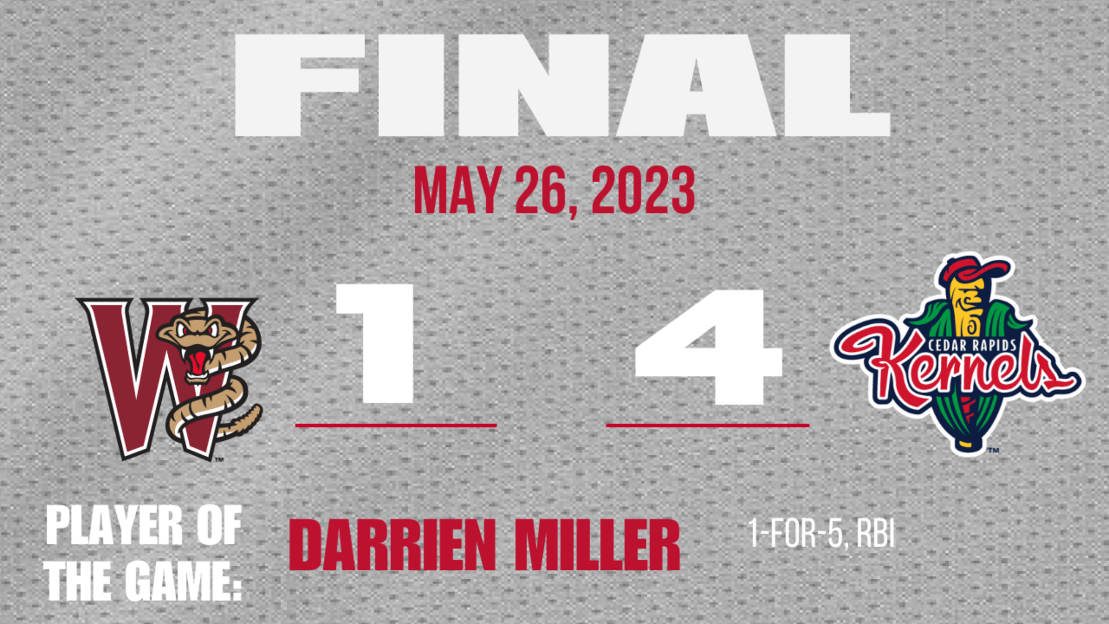 CEDAR RAPIDS, IA – The Wisconsin Timber Rattlers were looking for a fourth consecutive win for the first time this season when they faced the Cedar Rapids Kernels on Friday night at PG Cares Field. The Rattlers only found four hits and an unearned run as they could not rally from an early deficit in a 4-1 loss to the Kernels.