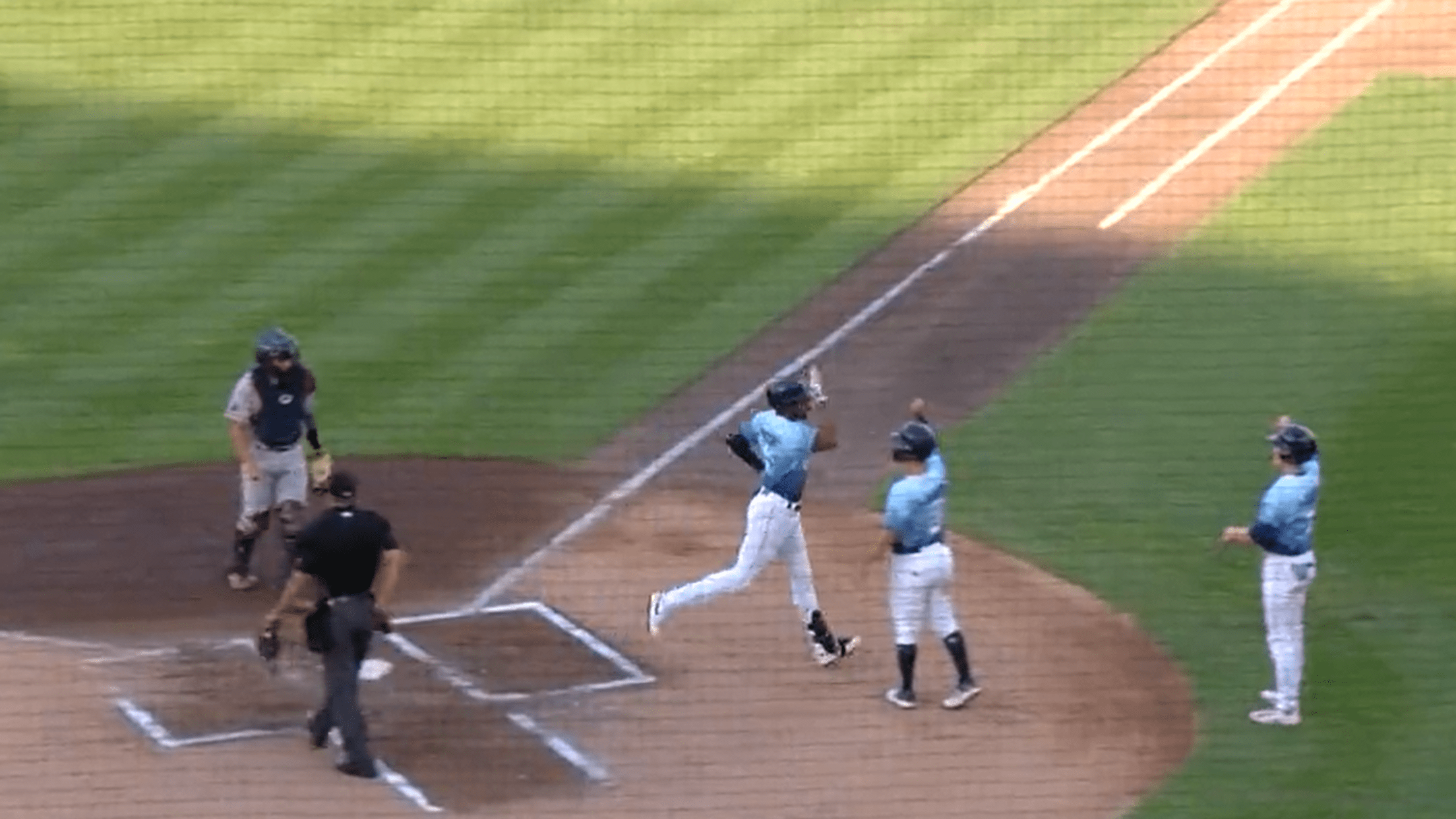 Joe Gray Jr is congratulated after his three-run homer in the bottom of the first inning gives Wisconsin a 3-2 lead against the Cedar Rapids Kernels on July 29, 2023. (Wisconsin Timber Rattlers)