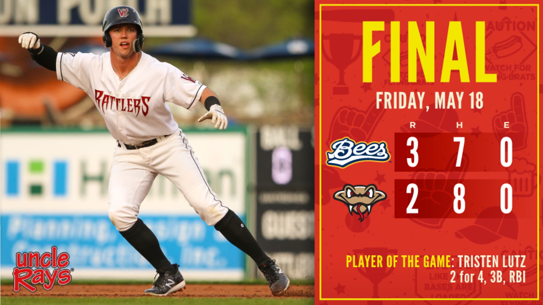 The Rattlers (18-23) took the lead with two runs in the bottom of the third inning. Nick Roscetti started the inning with a double and took third on a wild pitch. Joantgel Segovia drove in Roscetti with a single. Tristen Lutz was next and he tripled to the corner in right to send Segovia home for a 2-0 lead. Lutz would try to score on a slow grounder to third off the bat of Demi Orimoloye, but he was thrown out at the plate. The Rattlers would not threaten to score again.