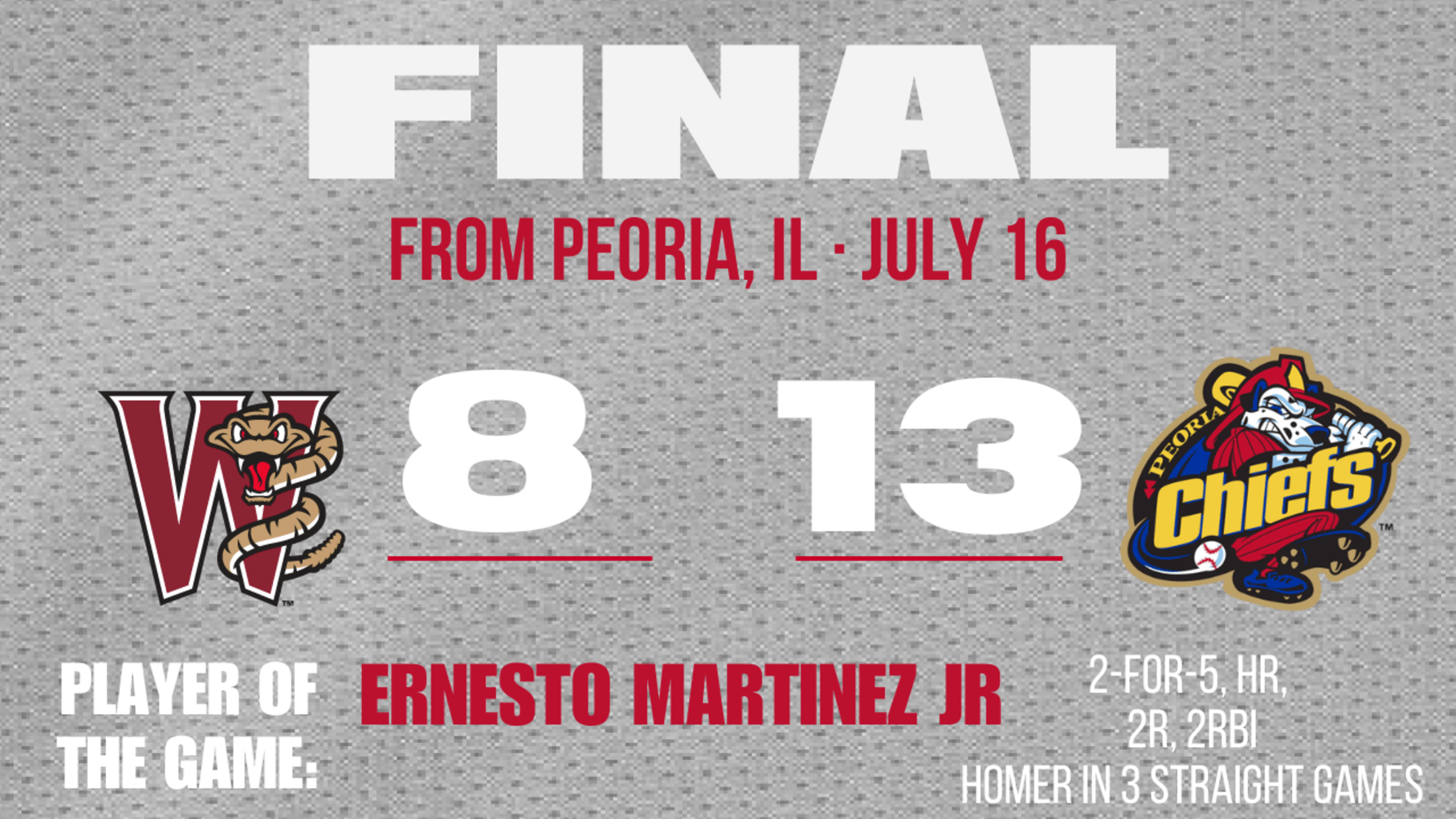 PEORIA, IL – The Wisconsin Timber Rattlers rallied from a 7-2 deficit to tie the Peoria Chiefs 7-7 in the top of the sixth inning on Sunday afternoon. Then, Osvaldo Tovalin had one last, big hit in him against the Timber Rattlers as he hit a two-out, three-run home run in the bottom of the sixth to put the Chiefs back in front and on their way to a 13-8 victory.