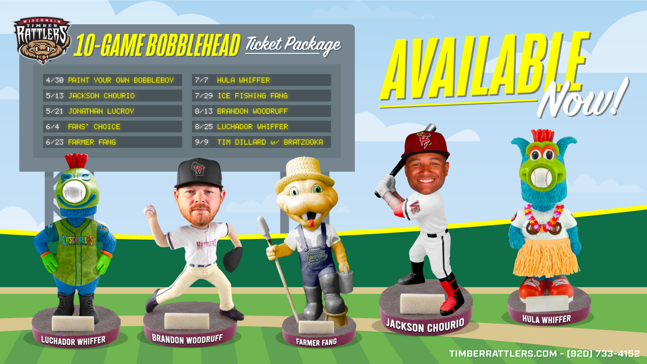 The Bobblehead Ticket Package may be purchased as a Box Seat option for $150 or a Reserved Bleacher Seat option for $120 online through timberrattlers.com, in person at the Timber Rattlers Box Office at Neuroscience Group Field at Fox Cities Stadium, or by calling (920) 733-4152.