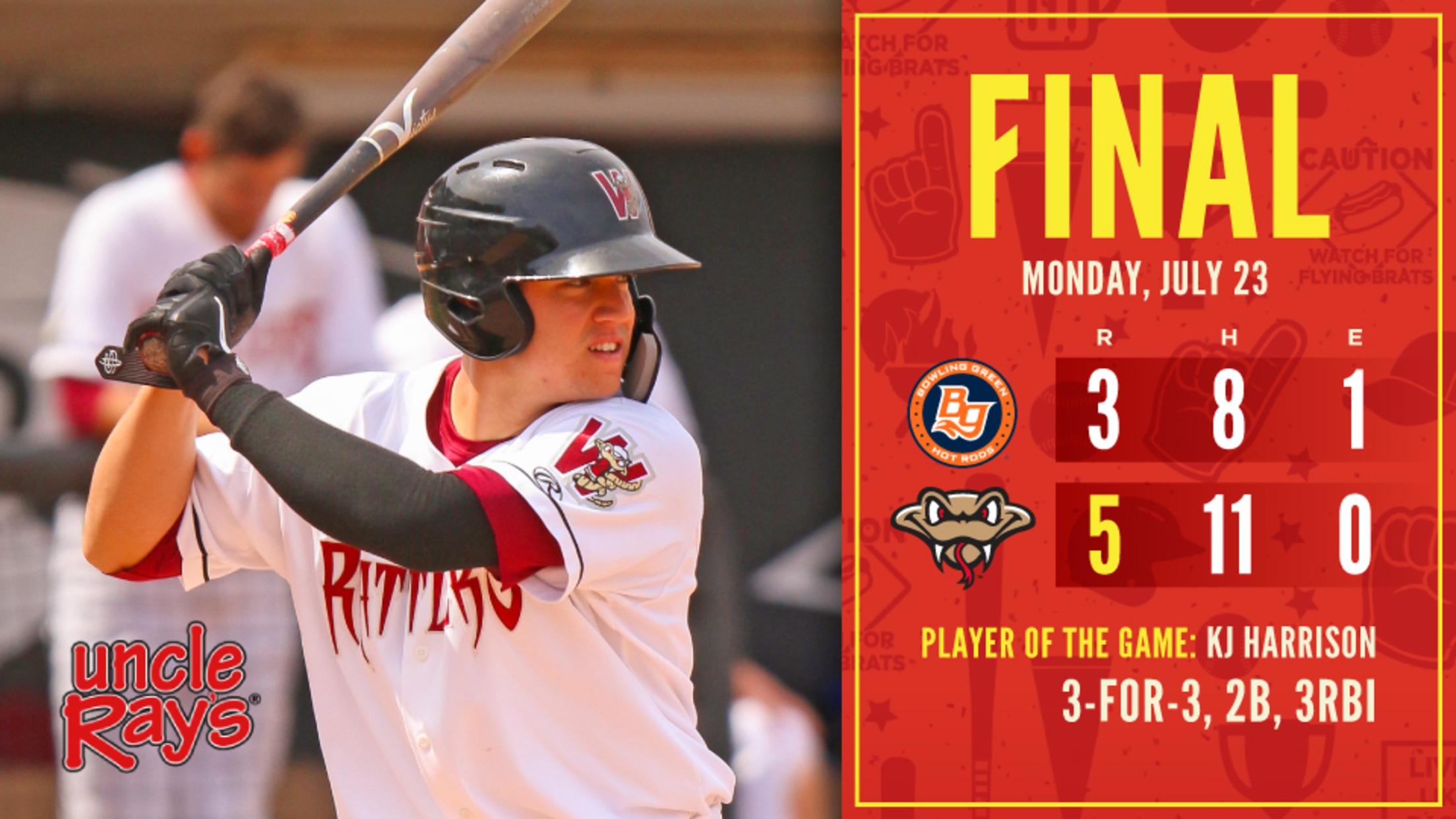 GRAND CHUTE, WI - The Wisconsin Timber Rattlers rallied from three different deficits before finally prevailing 5-3 over the Bowling Green Hot Rods on Monday afternoon at Neuroscience Group Field at Fox Cities Stadium. KJ Harrison continued his hot hitting to lead the Rattlers past the team with the best