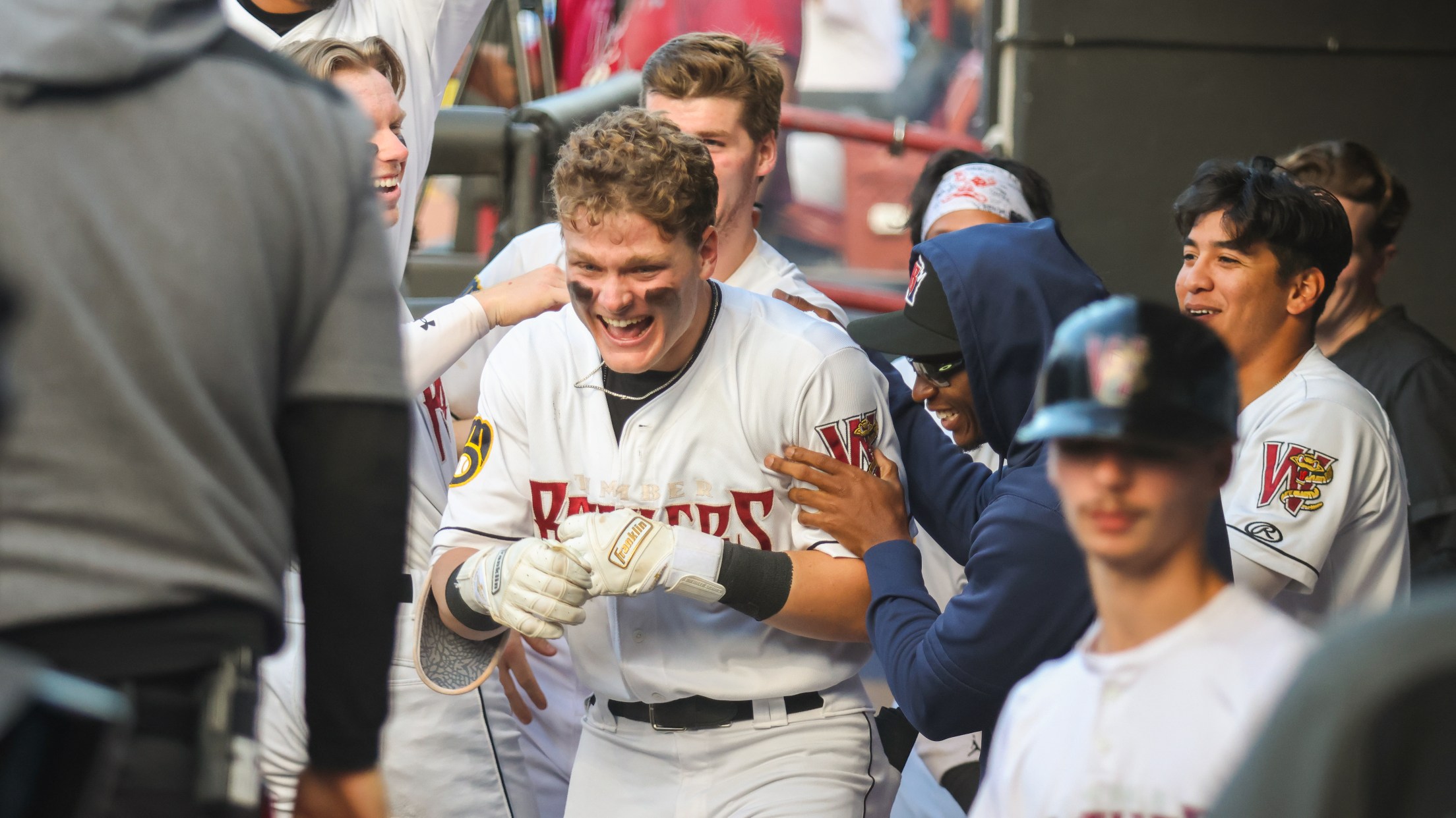 Tayden Hall is congratulated by his teammates after his home run in the fourth inning put the Wisconsin Timber Rattlers up 3-2 over the Quad Cities River Bandits on June 8, 2024. Wisconsin went on to win the game 9-3. (Wisconsin Timber Rattlers)