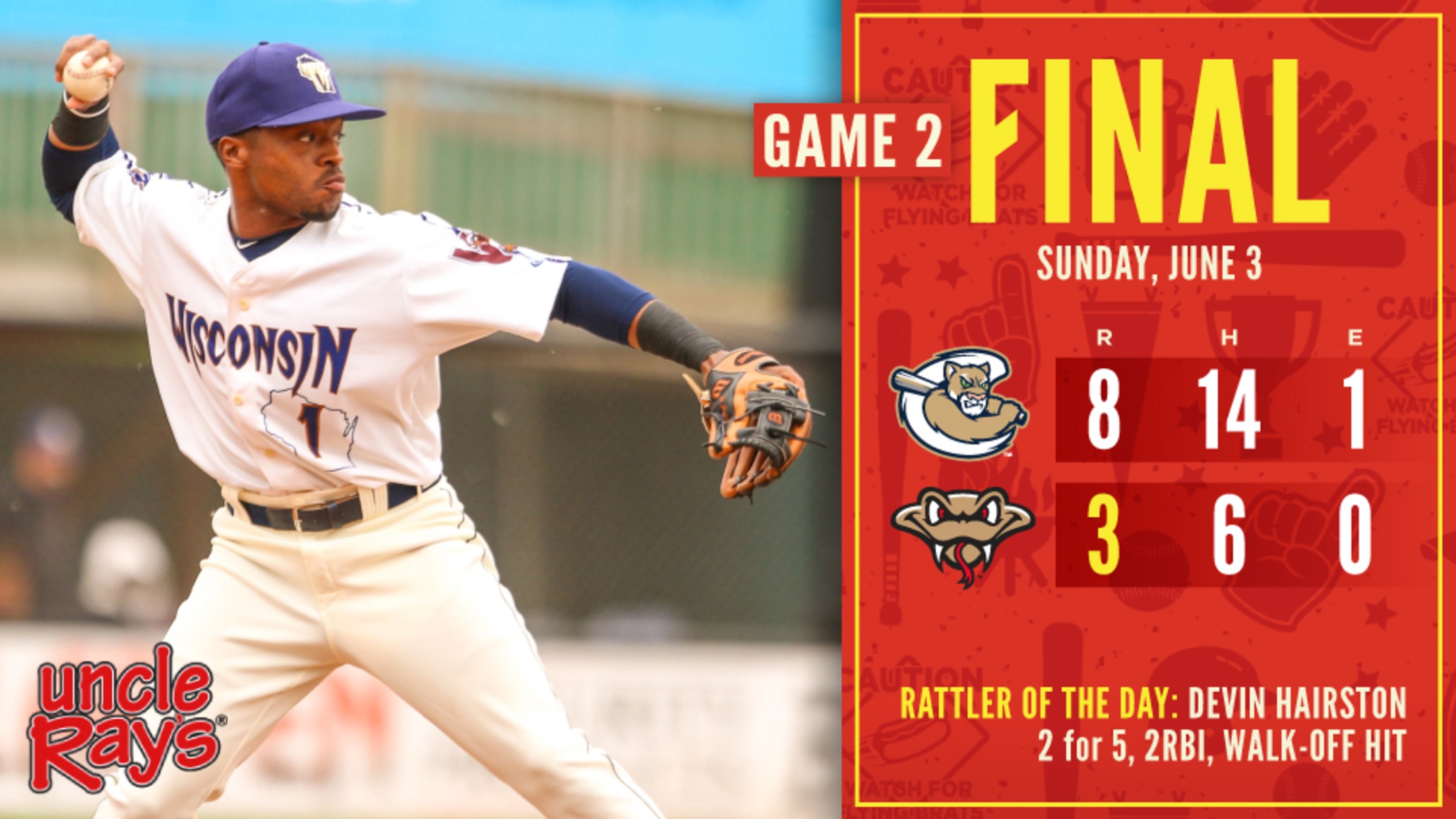 Wisconsin (25-32) rallied in the fifth inning with three runs against Cougars starting pitcher Jake Winston. Tristen Lutz and Gilbert Lara started to uprising with back-to-back singles. Devin Hairston keep the line moving with a single to center to score Lutz. Trever Morrison cashed in two more runs with a two-out double to center. Winston, who was making just his second start as a professional after 71 relief appearances since 2016, would walk Demi Orimoloye to bring the tying run to the plate. Winston would leave for some bullpen help and he got it as Breckin Williams struck out Pat McInerney. The Rattlers would get one more hit in the game.