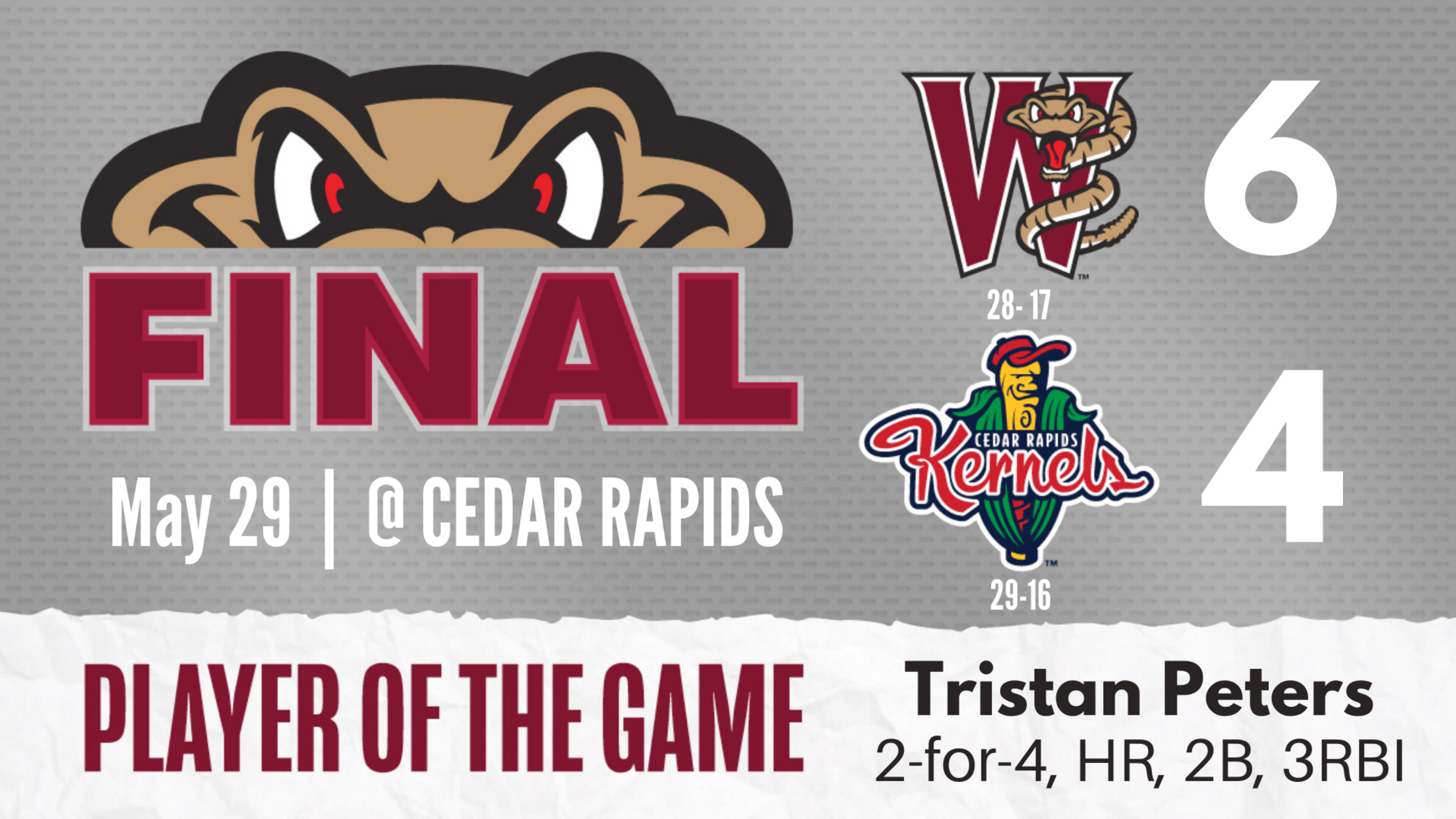 CEDAR RAPIDS, IA – It wasn’t easy. It wasn’t pretty. However, it was a win and the Wisconsin Timber Rattlers 6-4 victory over the Cedar Rapids Kernels Sunday afternoon at Perfect Game Field earned Wisconsin a split in the six-game series and pulled them back to within a game of the division leading Kernels.