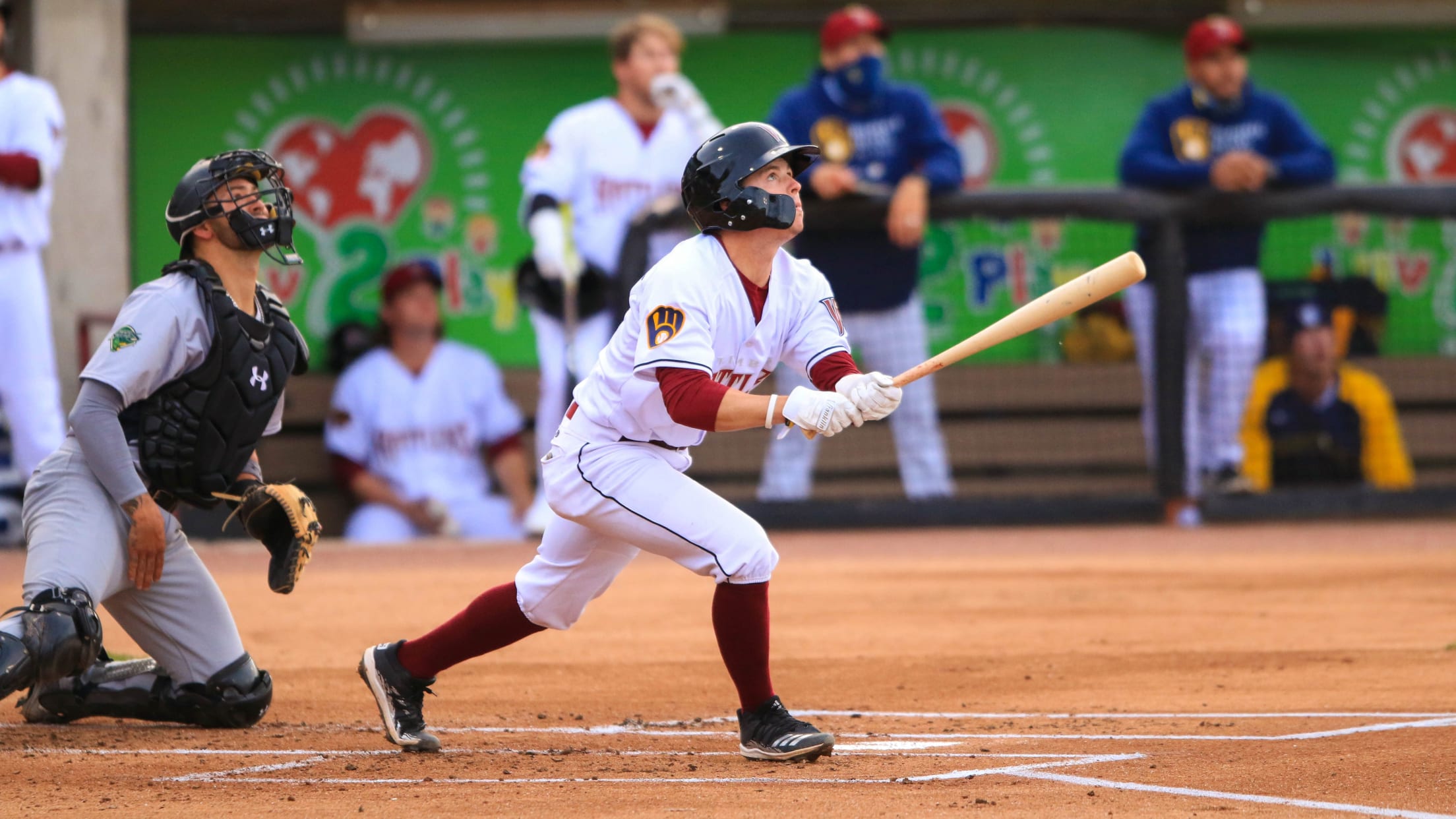 Hayden Cantrelle, pictured here against Beloit earlier this season, hit a two-run homer in the eighth inning at Cedar Rapids on May 26 to put the Rattlers up 4-0 on the way to a 5-0 win over the Kernels. (Wisconsin Timber Rattlers)
