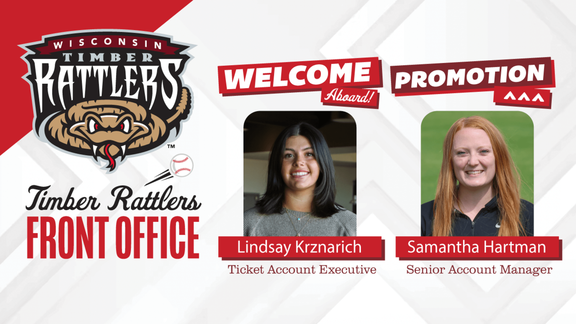 GRAND CHUTE, WI – The Wisconsin Timber Rattlers are announcing two moves in their front office prior to the start of the 2025 Midwest League season. Samantha Hartman has been promoted to Senior Account Manager and Lindsay Krznarich joins the Timber Rattlers ticket team.