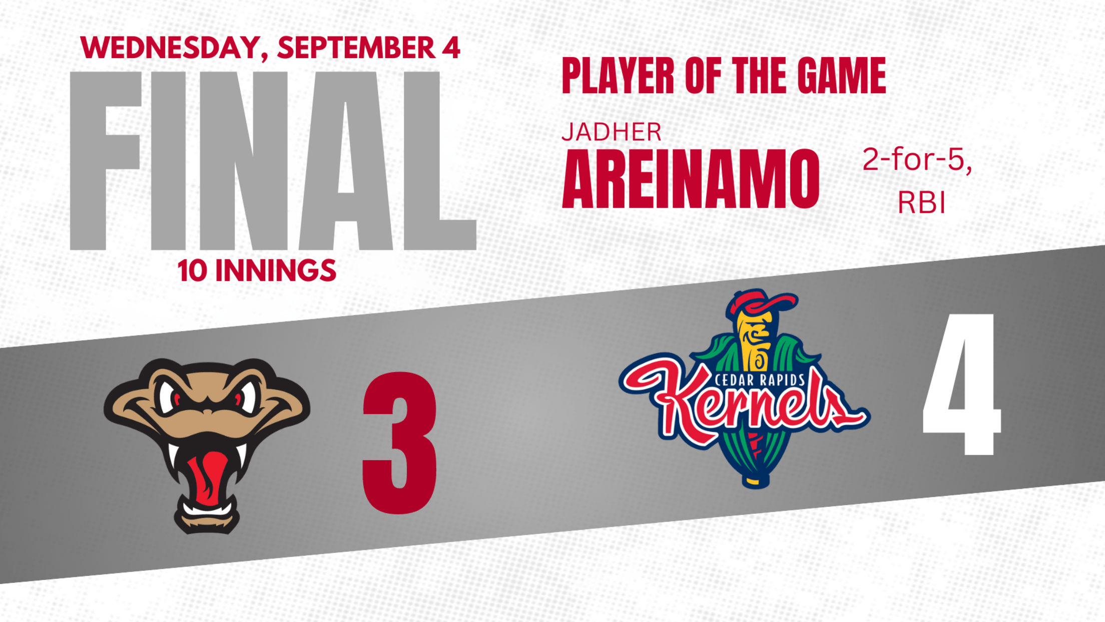 The top of the ninth inning started with a strikeout by Kernels reliever Xander Hamilton. Felix Valerio reached on an infield single and Eduarqui Fernandez walked. A wild pitch moved both runners into scoring position. Jheremy Vargas laced a single to center to score Valerio.