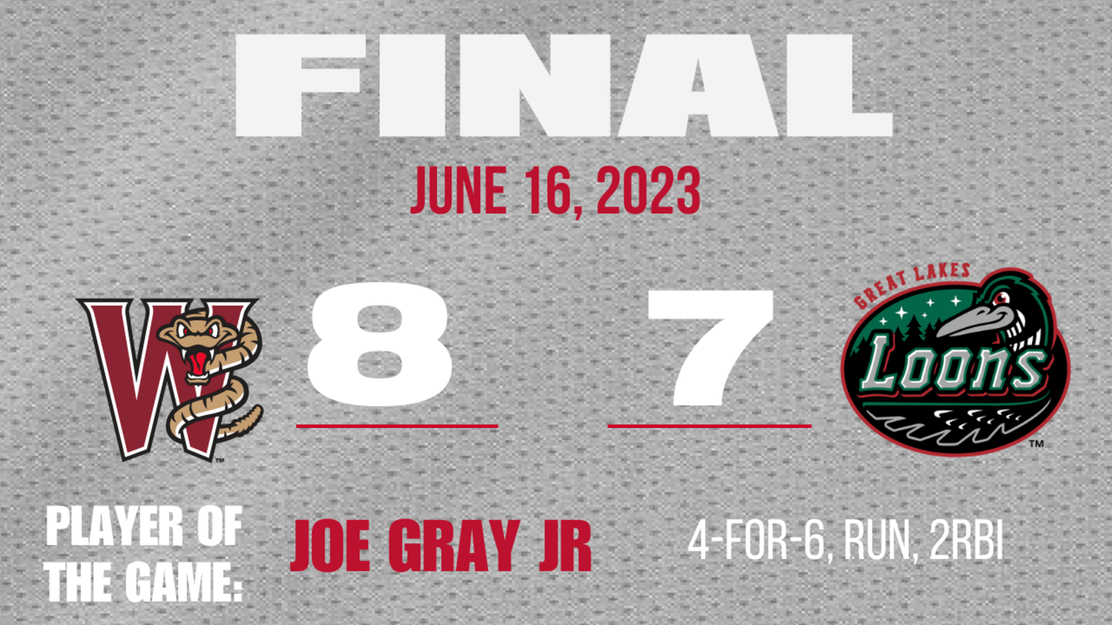 MIDLAND, MI – Both the Wisconsin Timber Rattlers and Great Lakes Loons were down to their final out in the ninth inning on Friday Night at Dow Diamond. Both teams received clutch home runs to extend the game to extra innings where Joe Gray Jr’s two-out, RBI single was enough