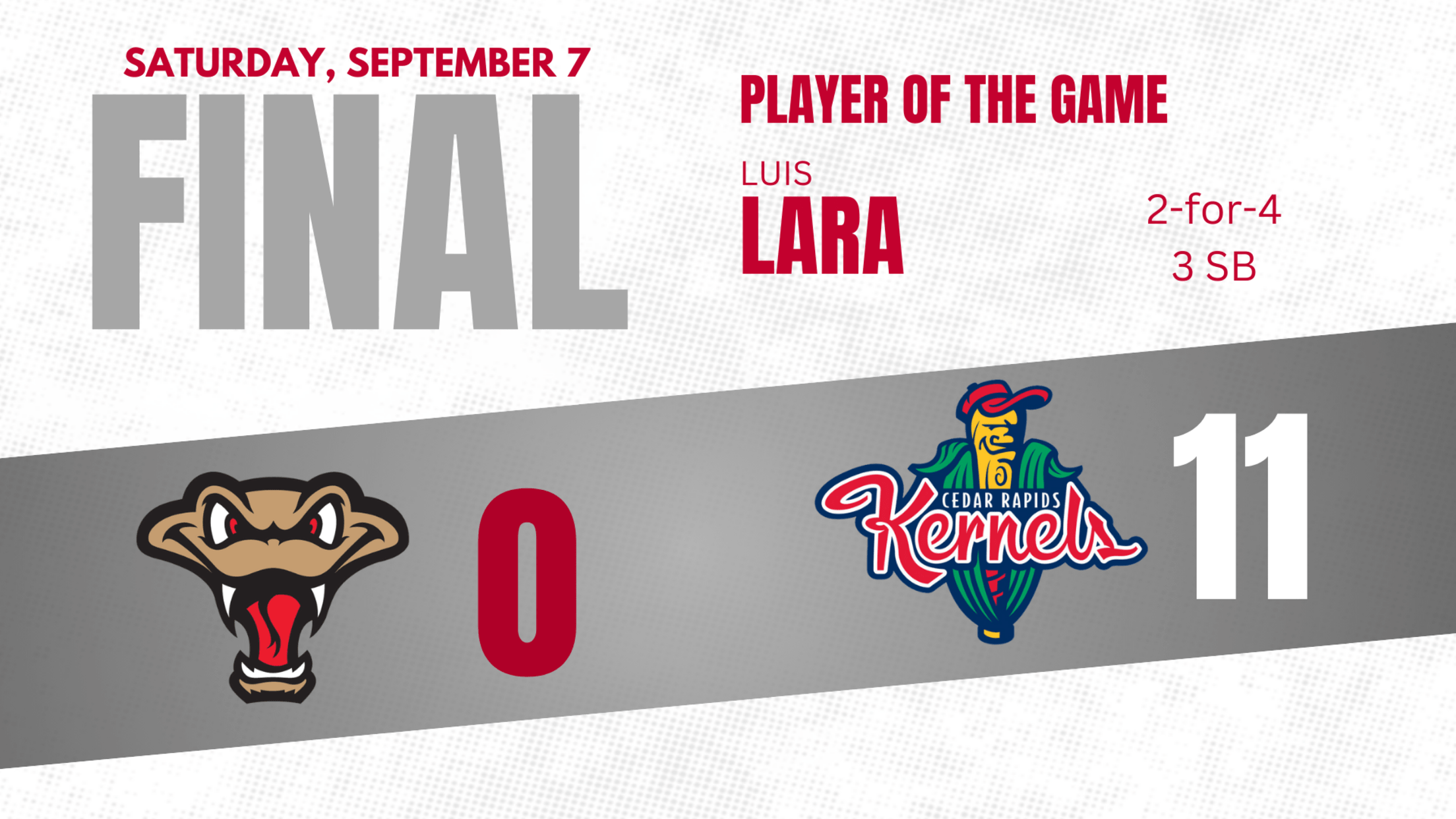 CEDAR RAPIDS, IA – The Cedar Rapids Kernels blew open a tight contest with the Wisconsin Timber Rattlers by scoring ten runs in the bottom of the eighth inning at Rise 2 Greatness Field on Saturday night. The Kernels defeated Wisconsin 11-0.