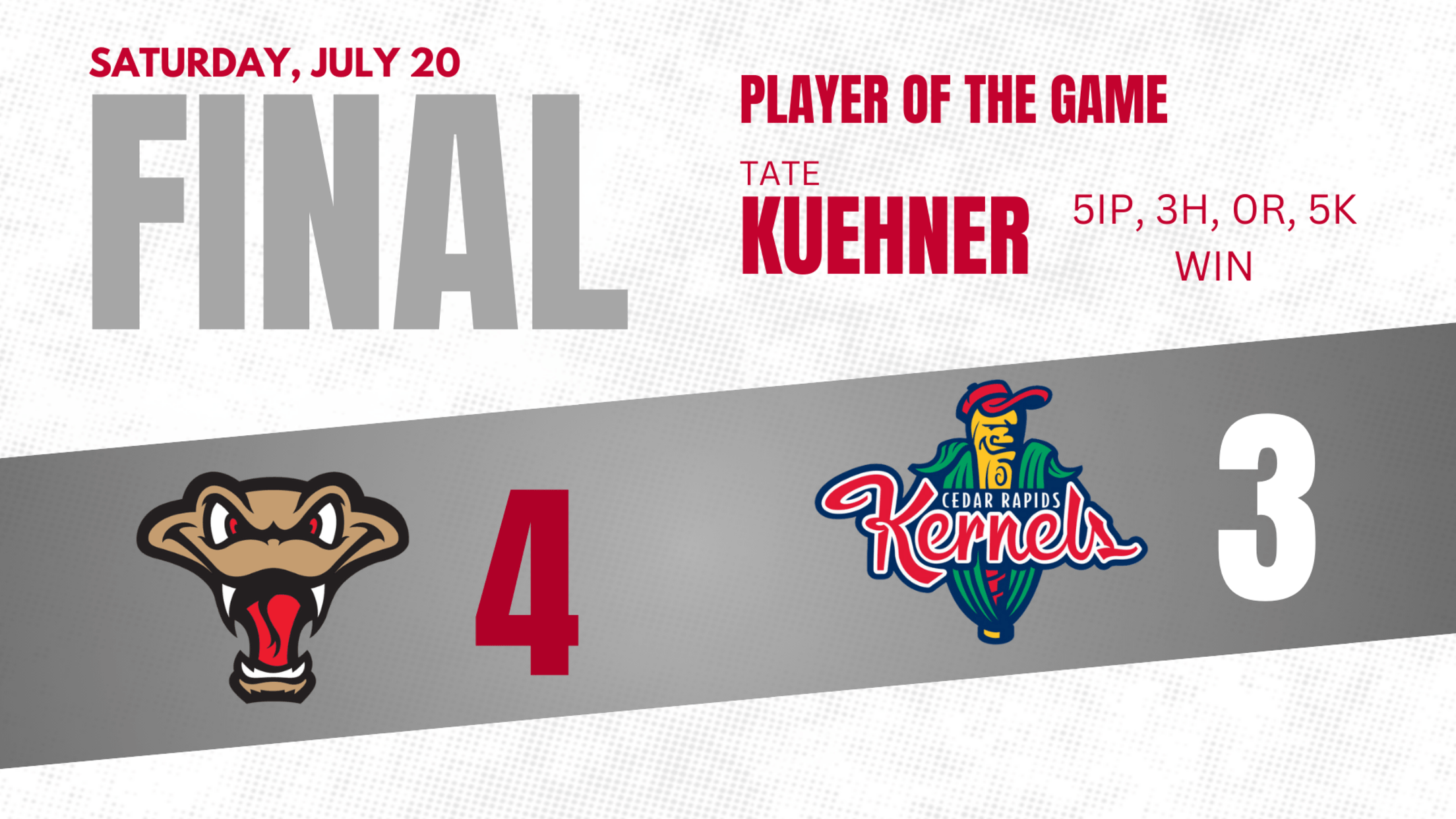 Tate Kuehner dealt with a few bumps in the road over his five scoreless innings. He walked a pair of Kernels in the second inning but closed out the inning with a pair of strikeouts. In the fourth, Cedar Rapids again had two on with one out before Kuehner escaped on a pair of flyouts to center. He would strike out five with two walks.