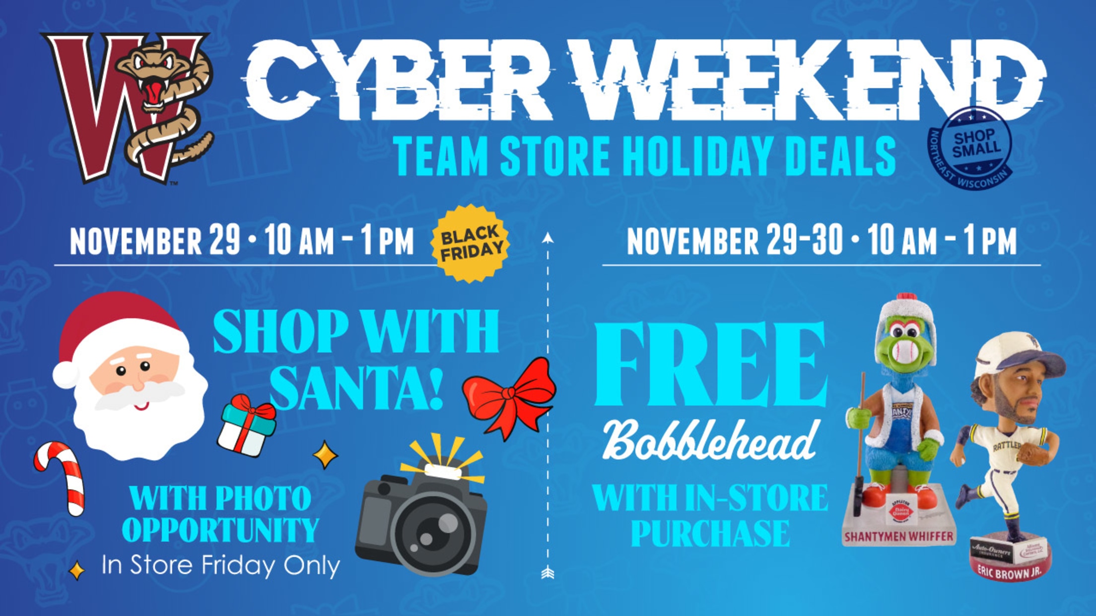 GRAND CHUTE, WI – The Wisconsin Timber Rattlers Snake Pit Team Store at Neuroscience Group Field will be open on Black Friday and Small Business Saturday. Santa is scheduled to meet with fans in the store on Black Friday. There are also amazing offers for Small Business Saturday, Cyber Weekend
