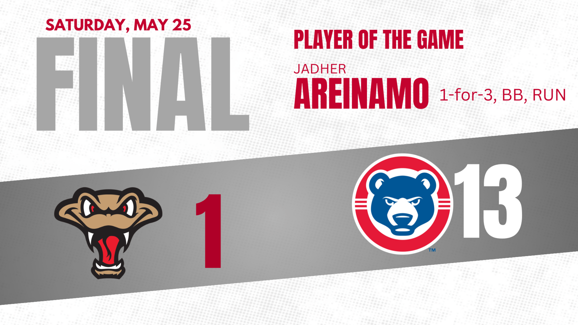 SOUTH BEND, IN – The South Bend Cubs scored eight runs in the second inning and cruised to a 13-1 victory over the Wisconsin Timber Rattlers Saturday afternoon at Four Winds Field. The loss was the third straight for the Rattlers, their first three-game losing streak of the season.