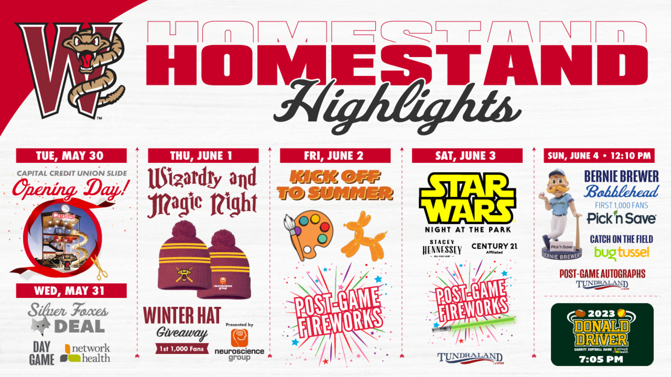 TUESDAY, MAY 30 at 6:40pm; Grand Opening of the Capital Credit Union Slide; Bang for Your Buck presented by NEW Manufacturing Alliance; Cancer Screening Awareness with Ascension Wisconsin: The night we have been waiting for is finally here! The Capital Credit Union Slide has its Grand Opening! Come out to the game to be one of the first to Ride the Slide! It’s also the final Bang for Your Buck Night in May. All fans may enjoy Cher-Make hotdogs and 16-ounce Pepsi Products for $2. Those of legal drinking age may purchase 16-ounce domestic beers for $2 on this Bang for Your Buck Night courtesy of NEW Manufacturing Alliance. The Cancer Prevention and Wellness Team from Ascension Wisconsin along with Genetech and the Wisconsin Timber Rattlers are holding a cancer screening awareness event during this game. Fans will learn more about recommended routine cancer screenings and how to prevent cancer. The MEGA Lung is going to be on display for fans to walk through as part of this night, too.