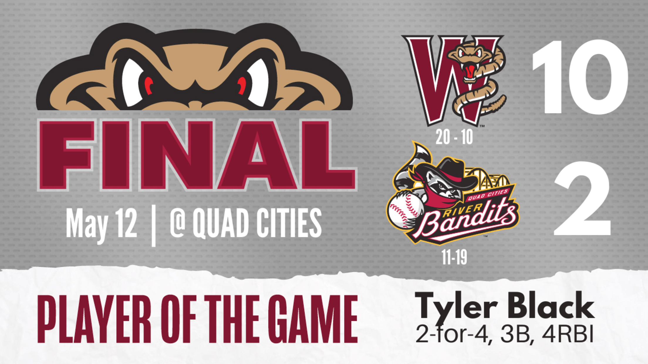DAVENPORT, IA – The Wisconsin Timber Rattlers didn’t let an early deficit bother them on Thursday night at Modern Woodmen Park. Wisconsin rallied past the Quad Cities River Bandits for a 10-2 victory to mark their first six-game winning streak of the season. Tyler Black knocked in four runs and