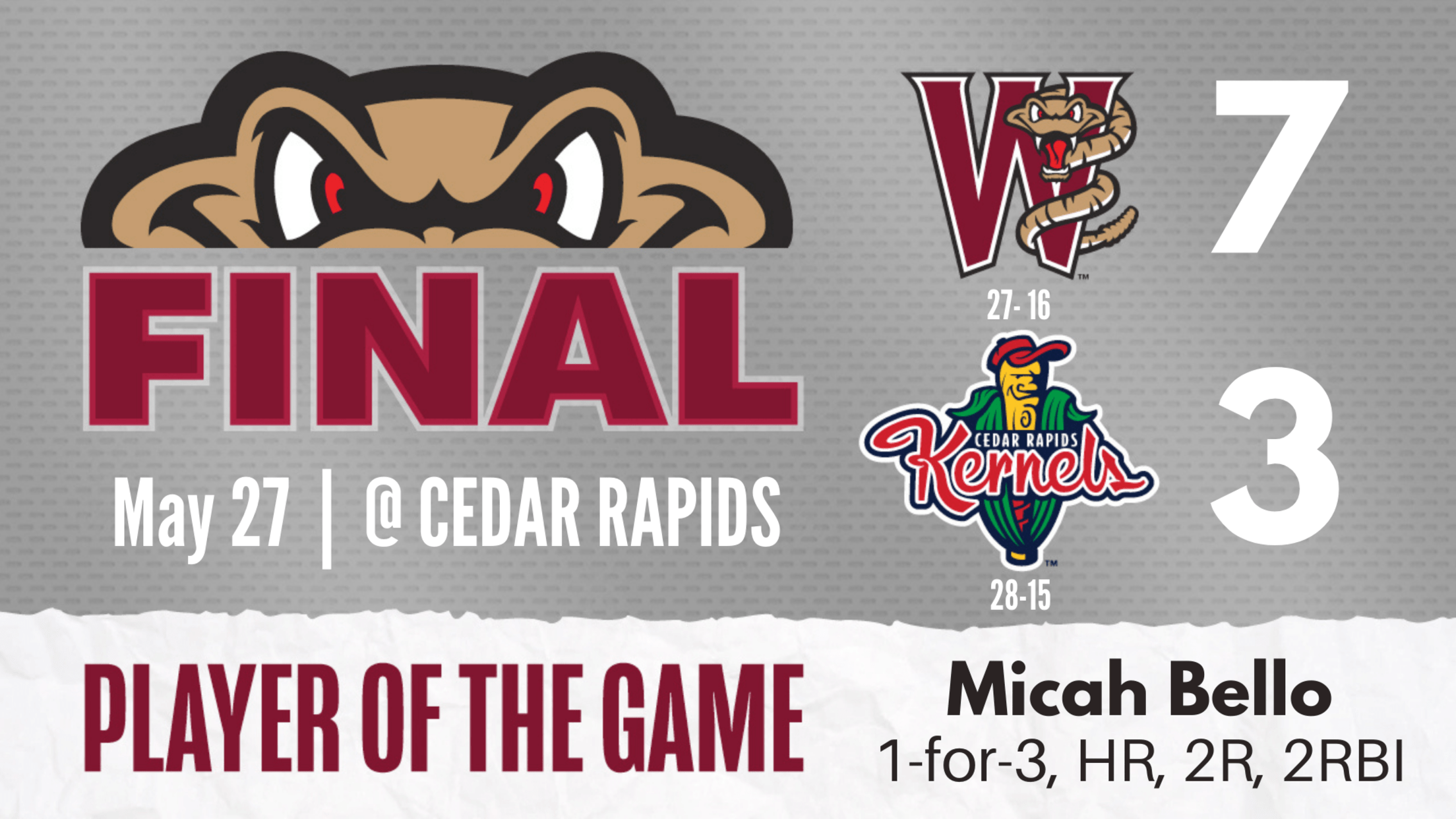 Sabato hit a lead-off home run in the bottom of the fourth for the Kernels (28-15) to tie the score 1-1.