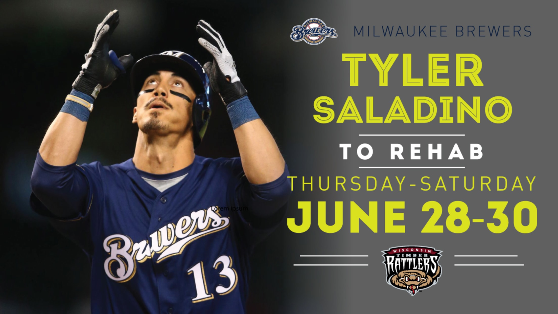 GRAND CHUTE, WI - The Milwaukee Brewers have announced that shortstop Tyler Saladino will begin a three-day rehabilitation assignment with the Wisconsin Timber Rattlers on Thursday, June 28. The Rattlers host the Clinton LumberKings at 7:05pm at Neuroscience Group Field at Fox Cities Stadium on Thursday and Friday with Saturday's