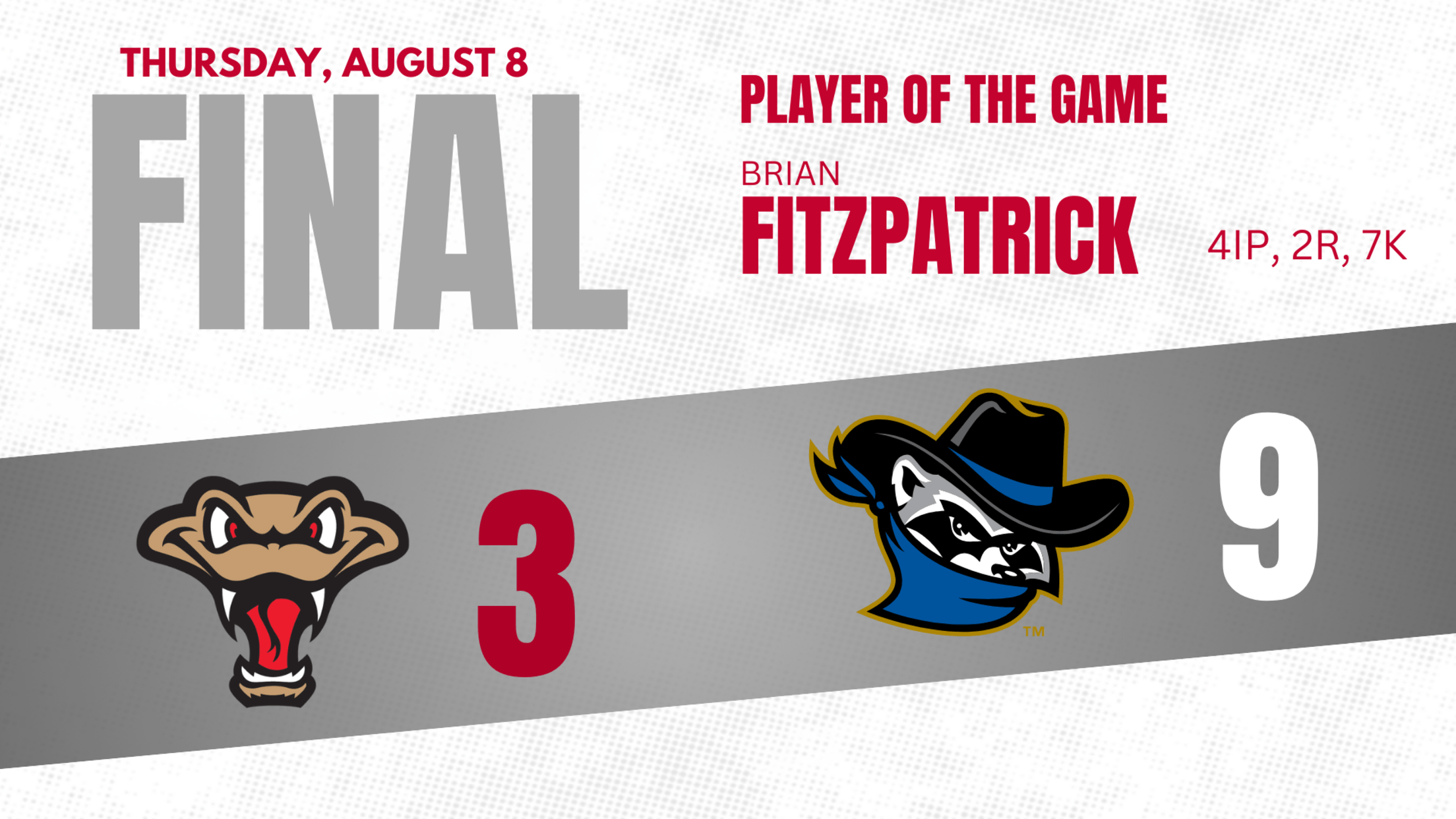 Fitzpatrick struck out seven and allowed two runs on four hits and three walks over four innings. Fitzpatrick matched his professional single-game high for strikeouts with his seven on Thursday night. In his last two starts, Fitzpatrick has fourteen strikeouts over nine innings.