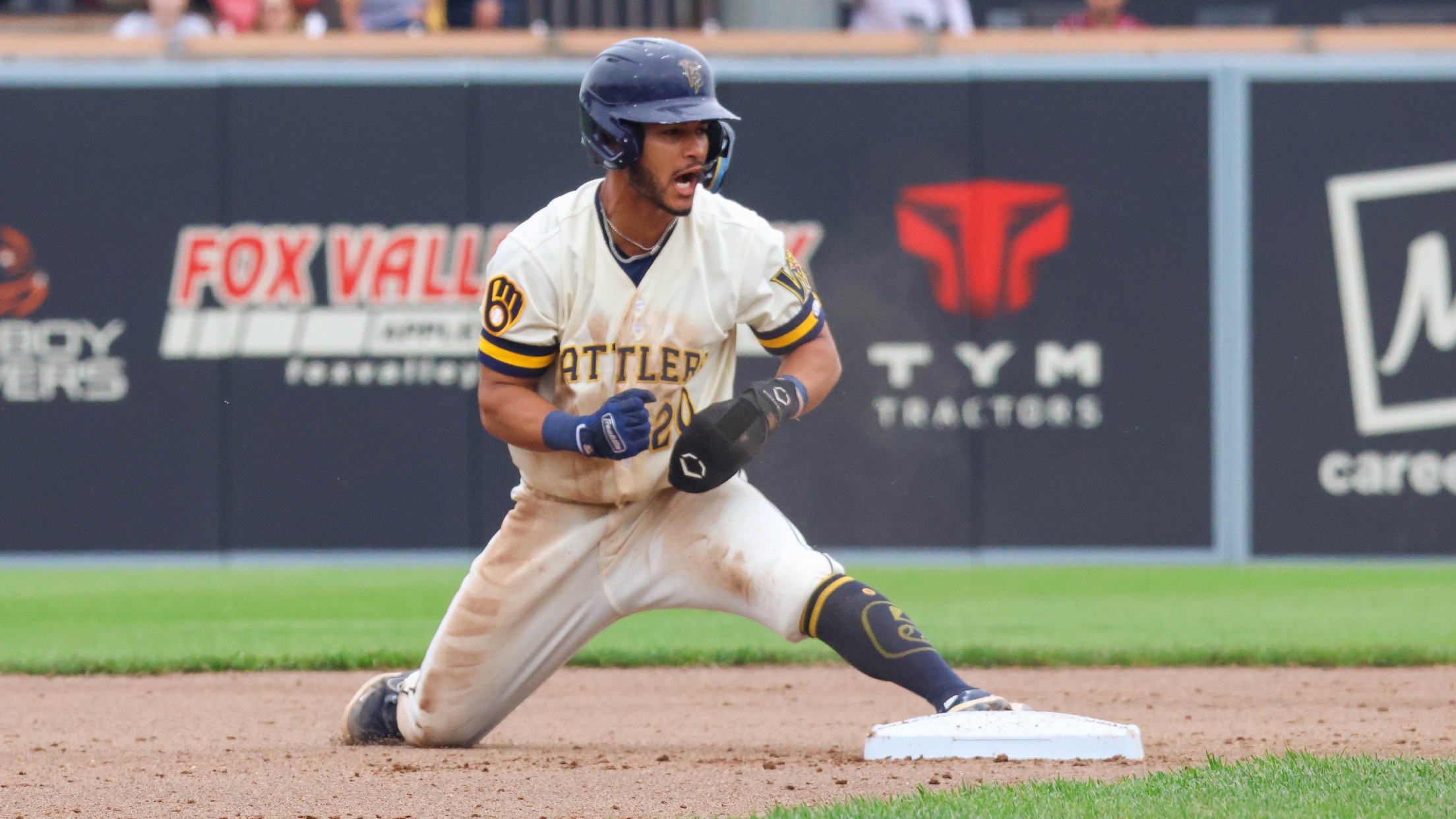 Eric Brown reacts after stealing second base during the third inning of Wisconsin's 4-2 win over the South Bend Cubs on May 13, 2023.  Brown was 2-for-4 with a walk, two stolen bases, and two runs scored for the Rattlers in the game.